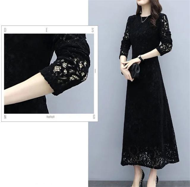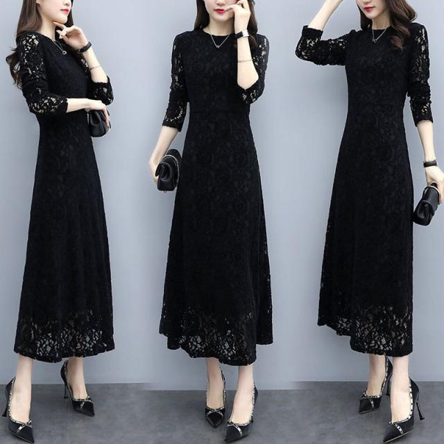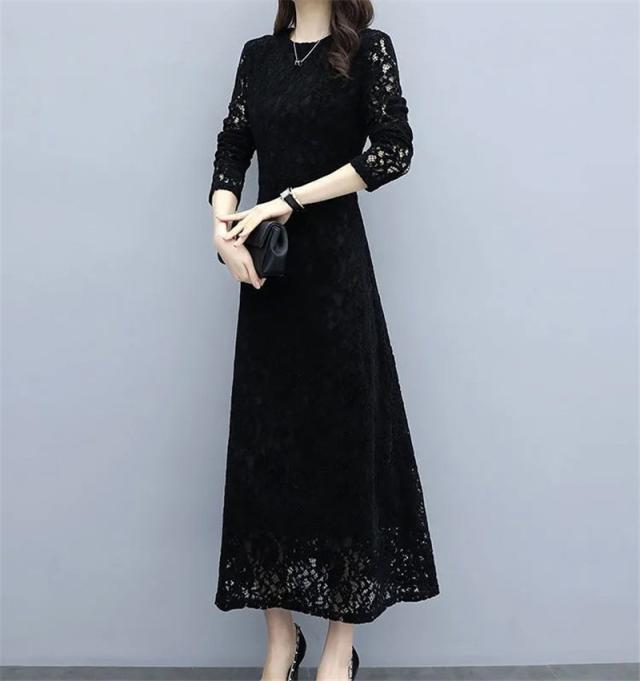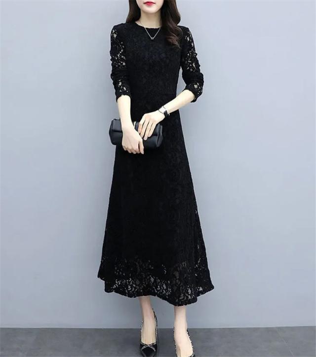 ワンピース レデイース 秋 長袖 ロング丈 総レース Aラインワンピース きれいめ 上品 黒 着痩せ おしゃれ 大人 通勤 二次会 入学式 送料無料