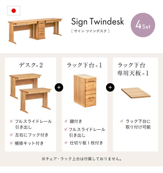 【国産/アルダー無垢材使用】ツインデスク フラット Sign(サイン) 日本製 学習机 学習デスク 勉強机 勉強デスク システムデスク シンプル 女の子 デスク ラック 木製 おしゃれ リビングデスク 堀田木工所