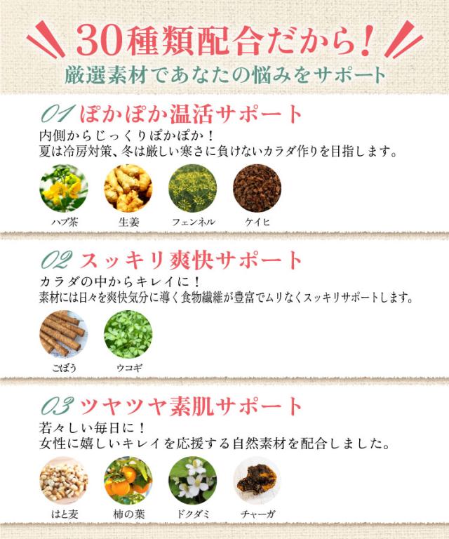 ハブ茶やプアール、生姜など自然素材をバランスよく配合しています。