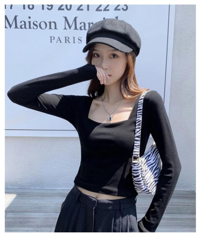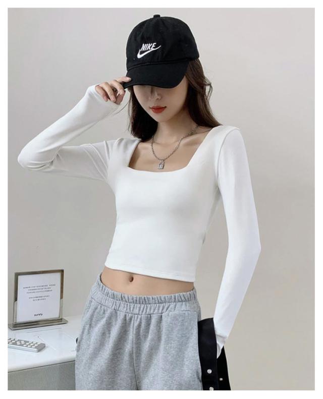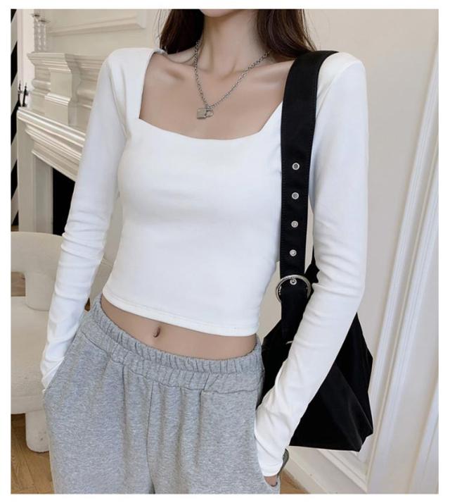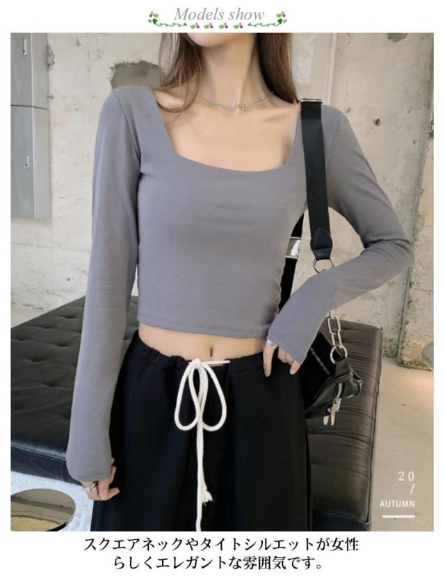 着痩せ 送料無料 レディース トップス 春秋 カットソー 長袖Tシャツ 大人 へそ出し ショート丈 タイト 着回し tシャツ スリム 無地 シンプル スクエアネック カジュアル 韓国ファッション Tシャツ