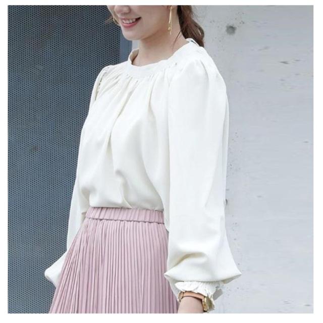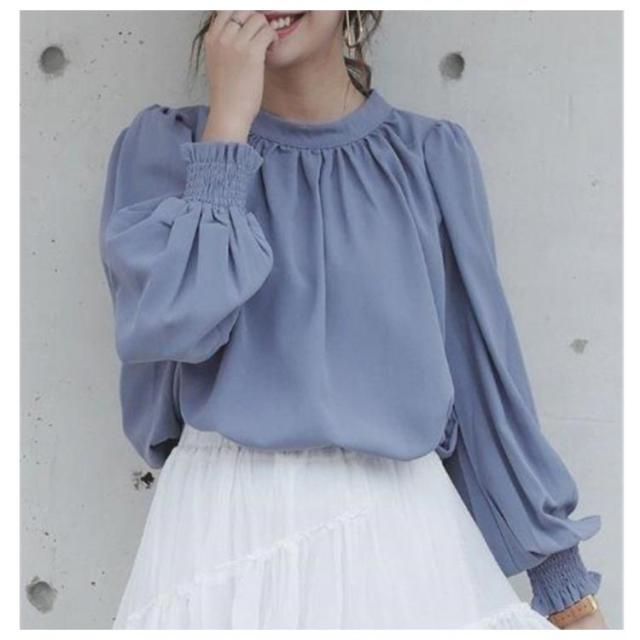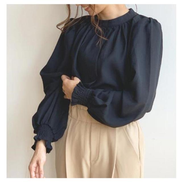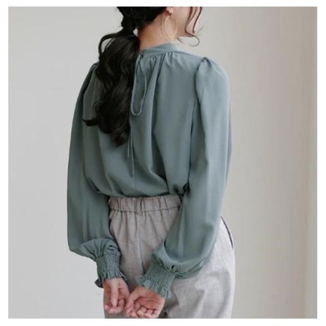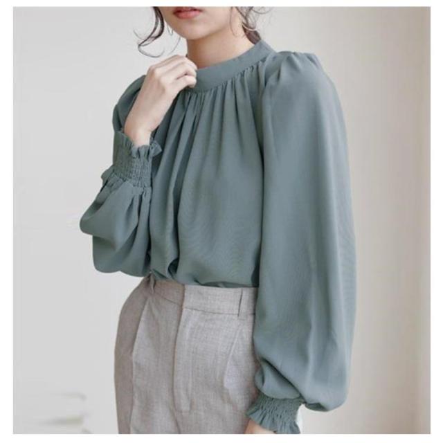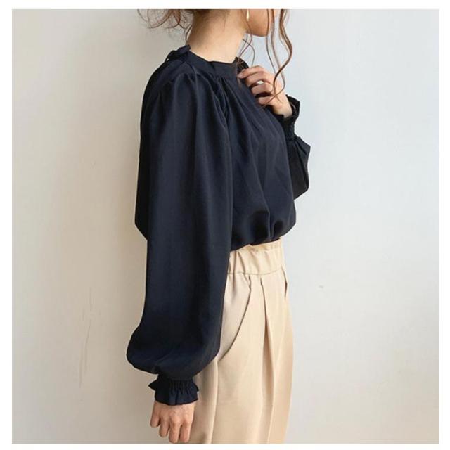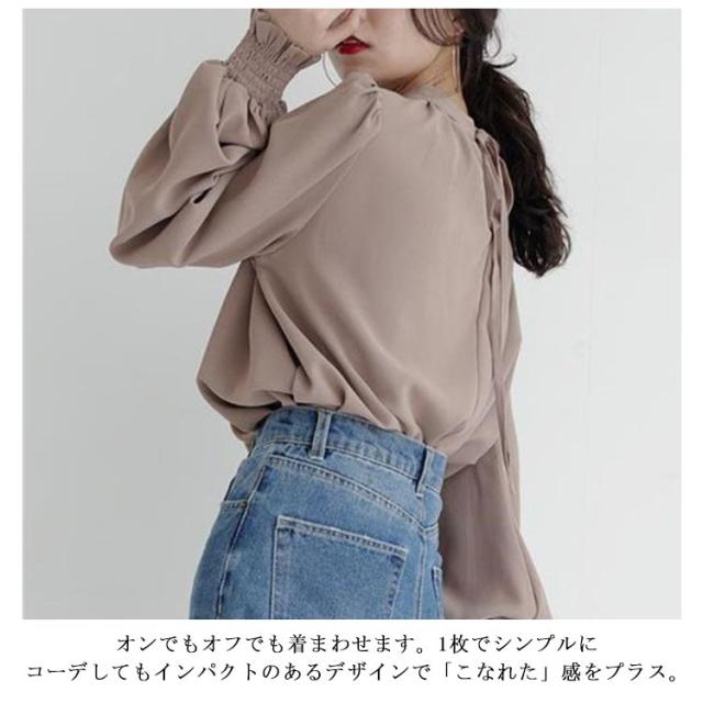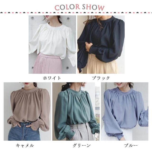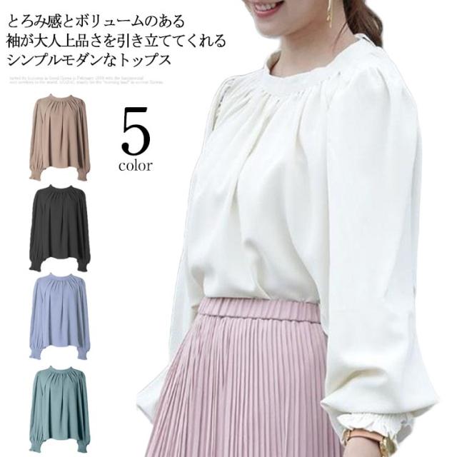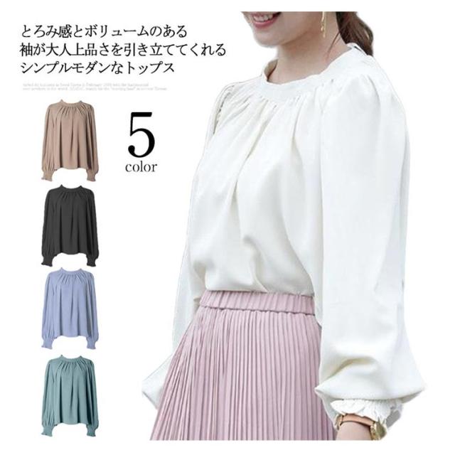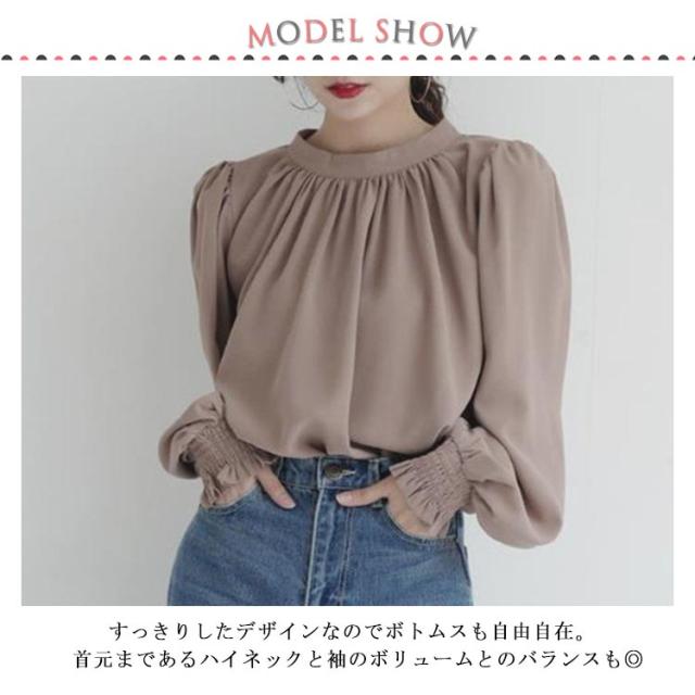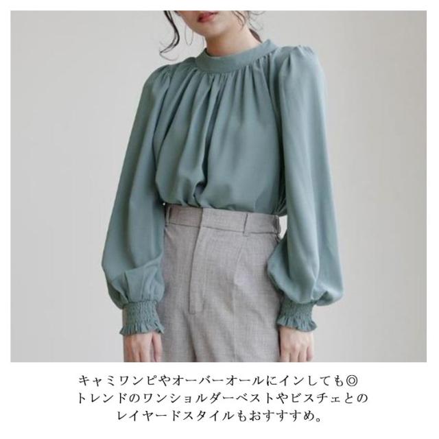 春 ハイネック 無地 長袖 スタンドカラー シャツ L レディース キレイめ 艶 無地 ギャザー インナー 長袖シャツ 入学式 卒園式 ブラウス バルーンスリーブブラウス ママコーデ 秋 冬 S M バルーンスリーブ