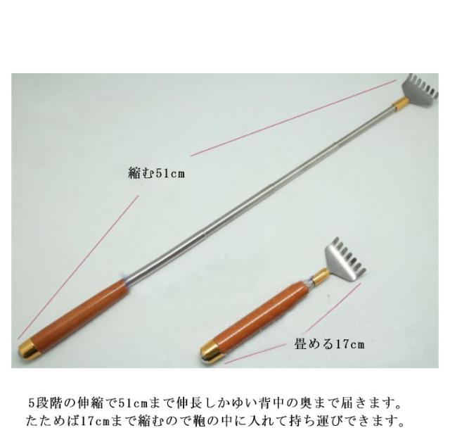 | 木製ハンドルの高級孫の手。 孫の手を持って背中に手を回しても、肩に負担を感じにくい軽量タイプ。 5段階の伸縮で51cmまで伸長しかゆい背中の奥まで届きます。 たためば17cmまで縮むので鞄の中に入れて持ち運びできます。 柄を逆さにして持てば、マッサージローラーのように使えるのも嬉しいポイント。 | |