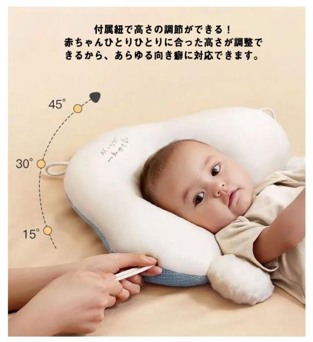 | ベビーまくらは向き癖防止、絶壁頭防止、寝ハゲ対策などで重宝されてきました。 コロンとした可愛らしいカタチとデザインをそなえながら、赤ちゃんの頭の絶壁防止に役立ちます。 新しいドーナツまくらはココが優れています♪ ポイント1 付属紐で高さの調節ができる! 赤ちゃんひとりひとりに合った高さが調整できるから、あらゆる向き癖に対応できます。 ポイント2 A/B面(A面綿、B面網状)デザイン、通気性に優れた、中綿素材を使用! 通気性も抜群で、汗もしっかり吸収します。 ポイント3 下両足部分取り外せる ポイント4 手洗いのみOKでいつも清潔に! 洗濯機では洗えません。洗濯機で洗って破損した場合は保証できません。 | |