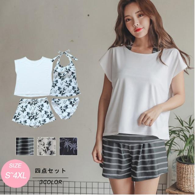 水着 レディース 4点セット ホルターネック タンキニ 体型カバー ママ水着 レディース水着 花柄 可愛い20代 30代 40代