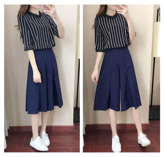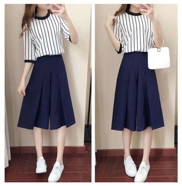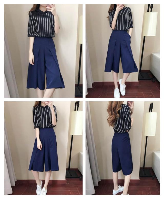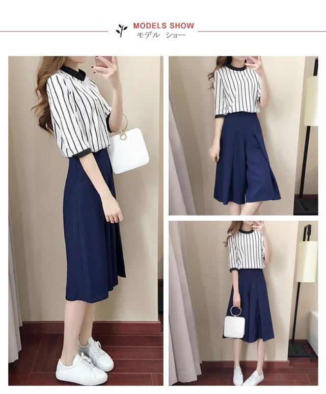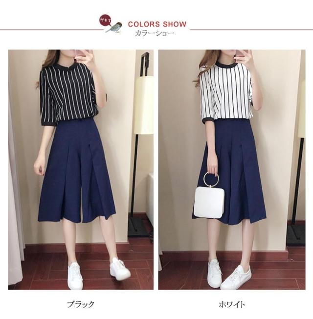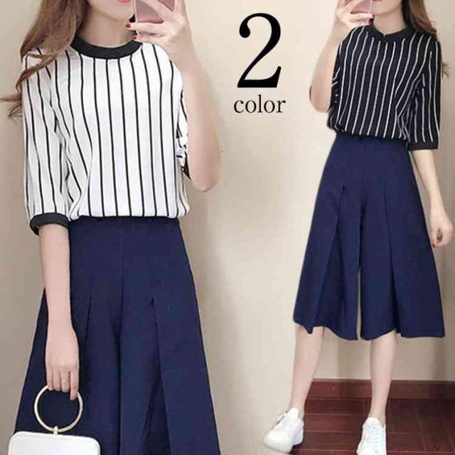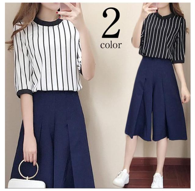 レディース セットアップ ストライプ ファッション 上品 夏 上下セット 半袖 七分丈ズボン 2点セット