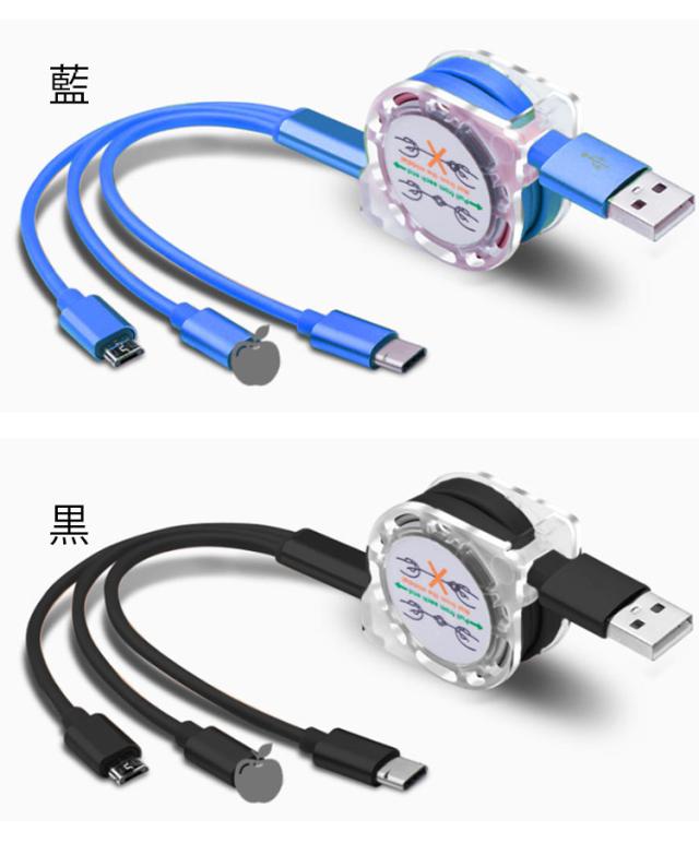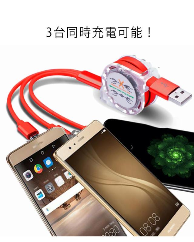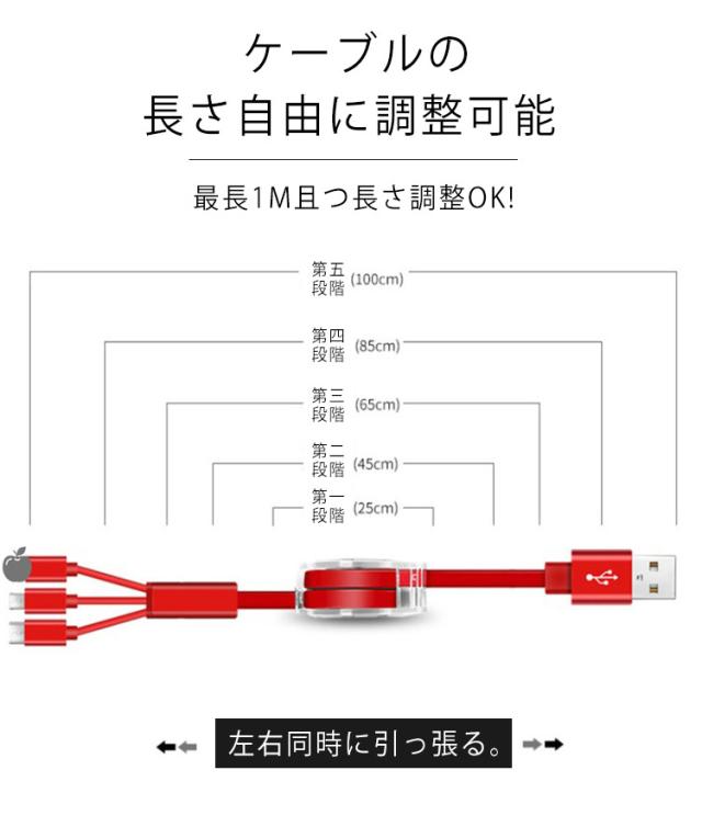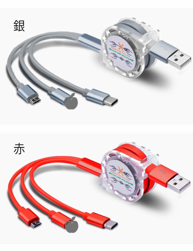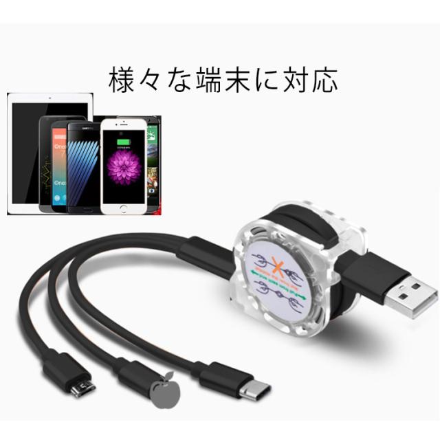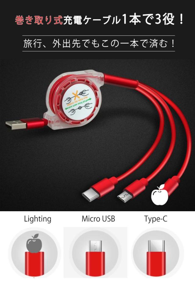 iPhone 充電 ケーブル 巻き取り ケーブル 3in1 巻き取り式 充電ケーブル USBケーブル 充電 ケーブル コード Lightning Type-C microUSB Android スマホ 充電 ライトニングケーブル マイクロusbケーブル 2.4A 一本三役 急速充電 高耐久 断線防止 送料無料