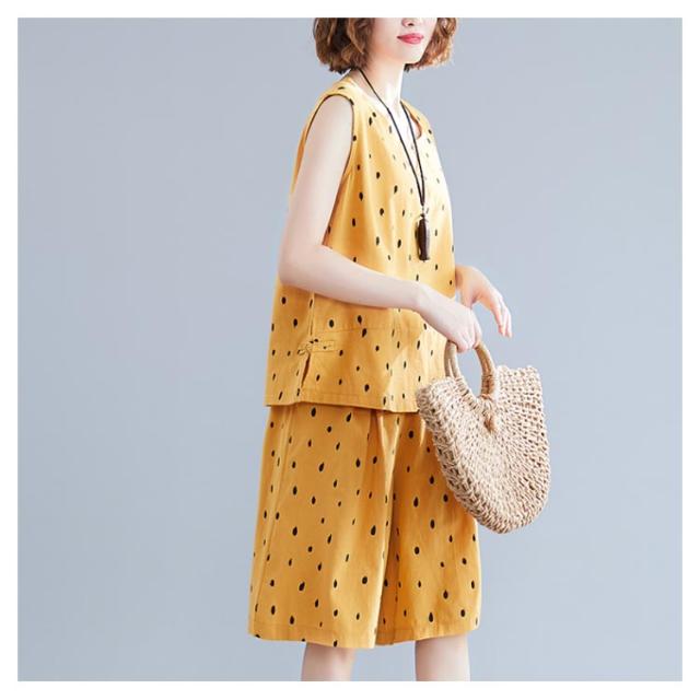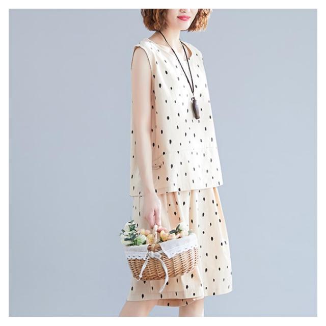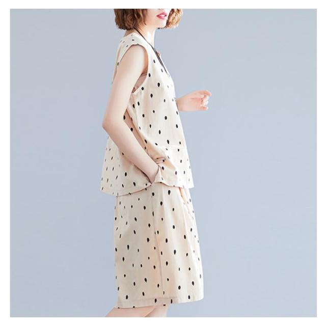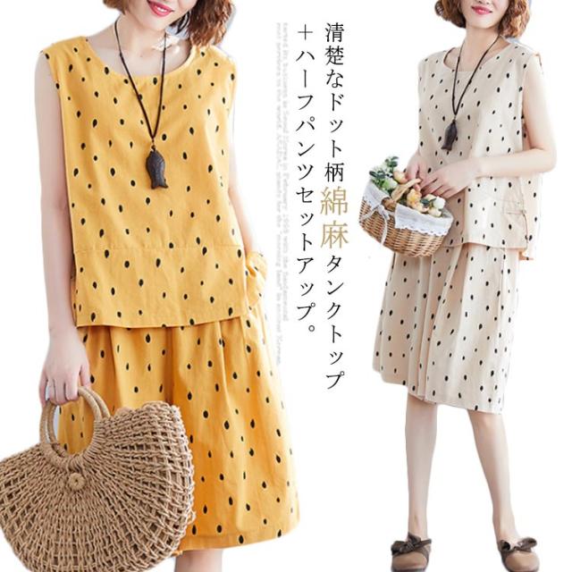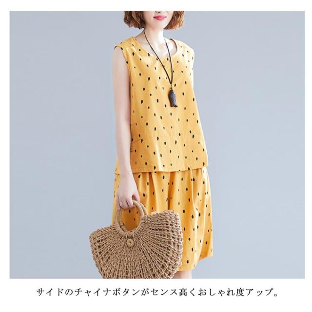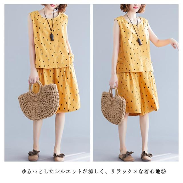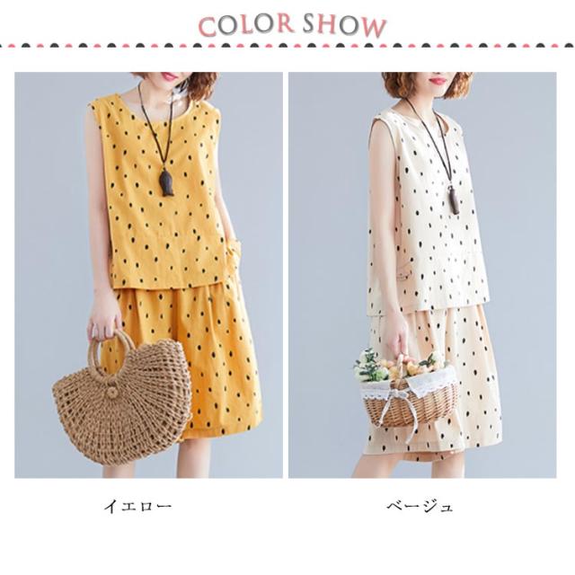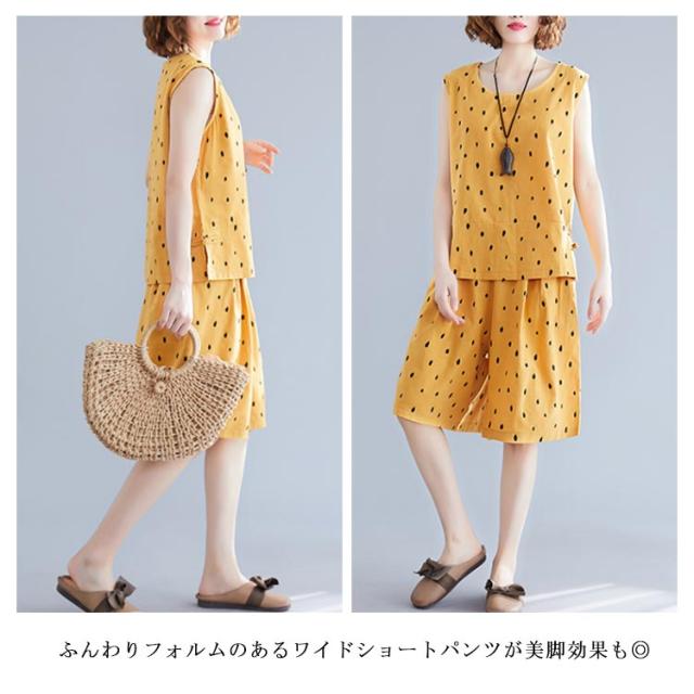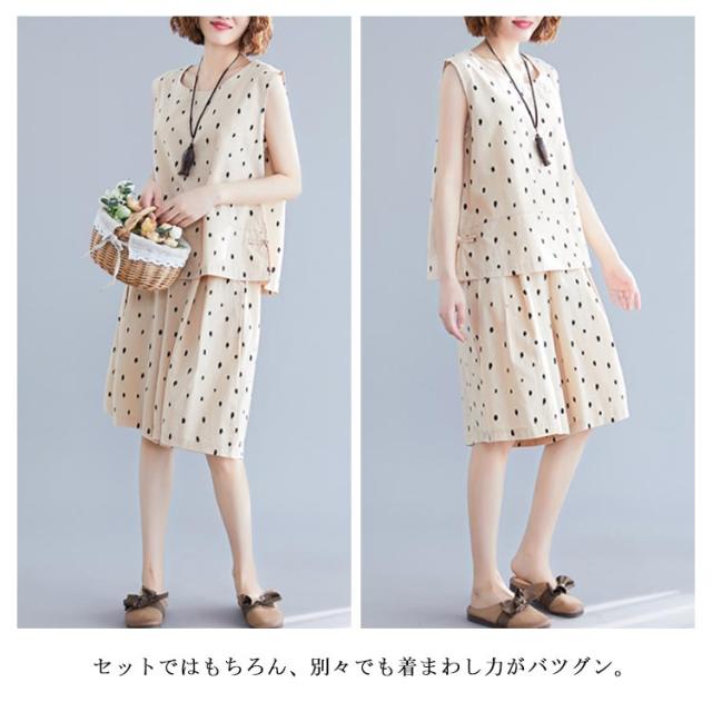 ノースリーブトップス×ショートパンツ セットアップ 送料無料 レディース 夏 袖なし ブラウス トップス ワイドパンツ ショパン 綿麻 リネン ドット柄 キュロットパンツ オールインワン