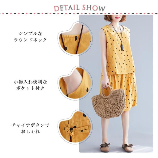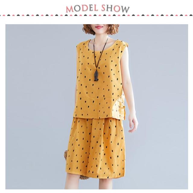 | 清楚なドット柄綿麻タンクトップ+ハーフパンツセットアップ。 ゆるっとしたシルエットが涼しく、リラックスな着心地◎ ふんわりフォルムのあるワイドショートパンツが美脚効果も◎ サイドのチャイナボタンがセンス高くおしゃれ度アップ。 これからの季節大活躍するから重宝します。 セットではもちろん、別々でも着まわし力がバツグン。 | |