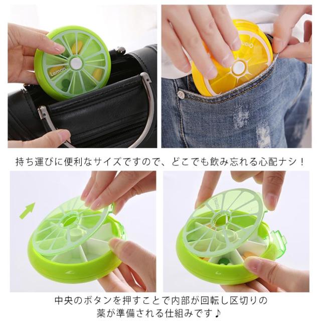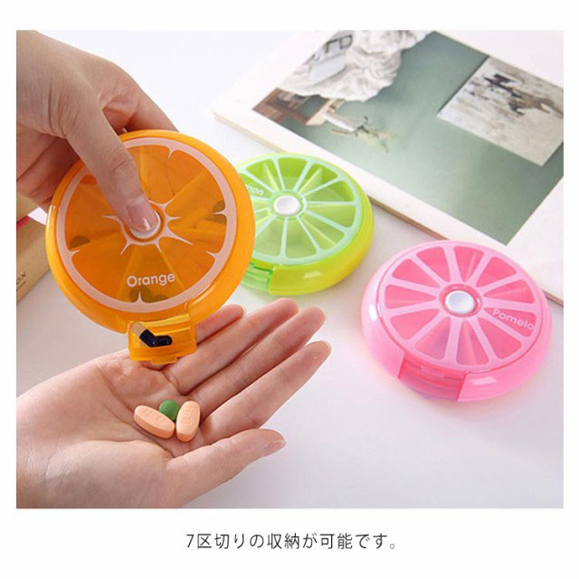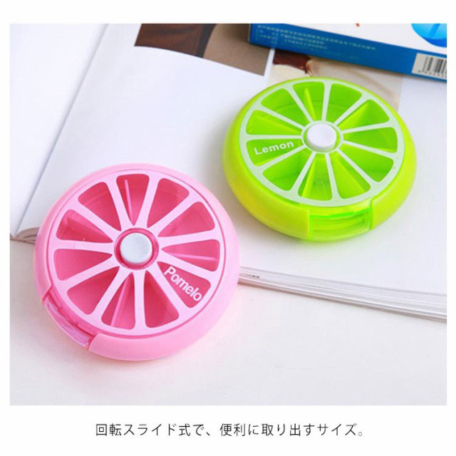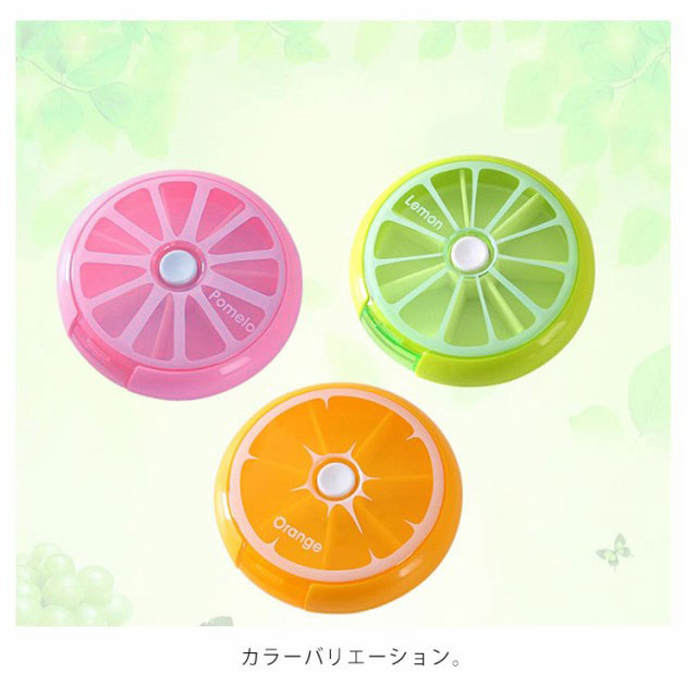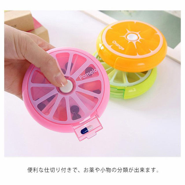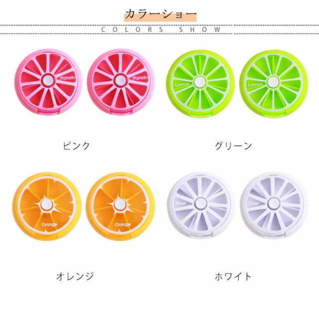 | とっても可愛いフルーツモチーフのサプリメントケース。迷?小?盒 カラーバリエーション。 ?色多? 便利な仕切り付きで、お薬や小物の分類が出来ます。分格 7区切りの収納が可能です。7小格 持ち運びに便利なサイズですので、どこでも飲み忘れる心配ナシ!小巧 上フタが開くので薬を一度に入れることができます。上盖打?放入?片 中央のボタンを押すことで内部が回転し区切りの薬が準備される仕組みです♪ 按下白色按? ??格子 | |