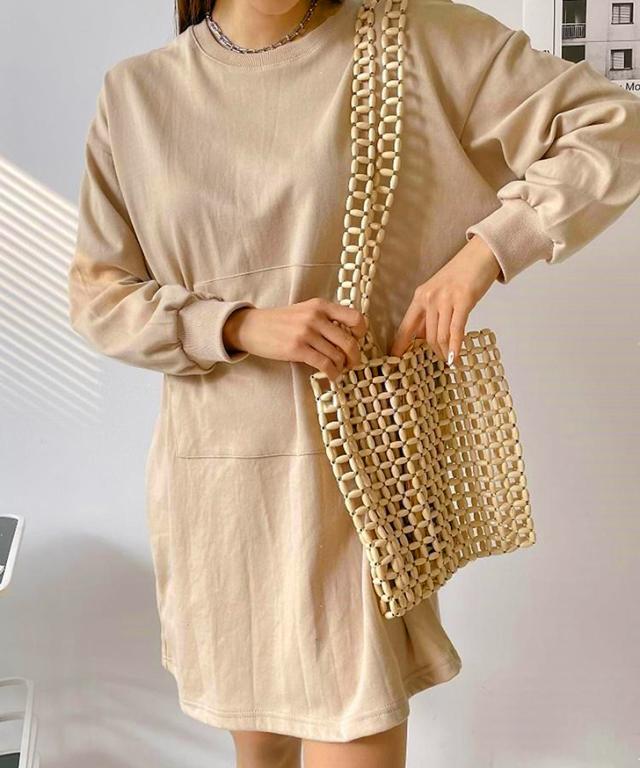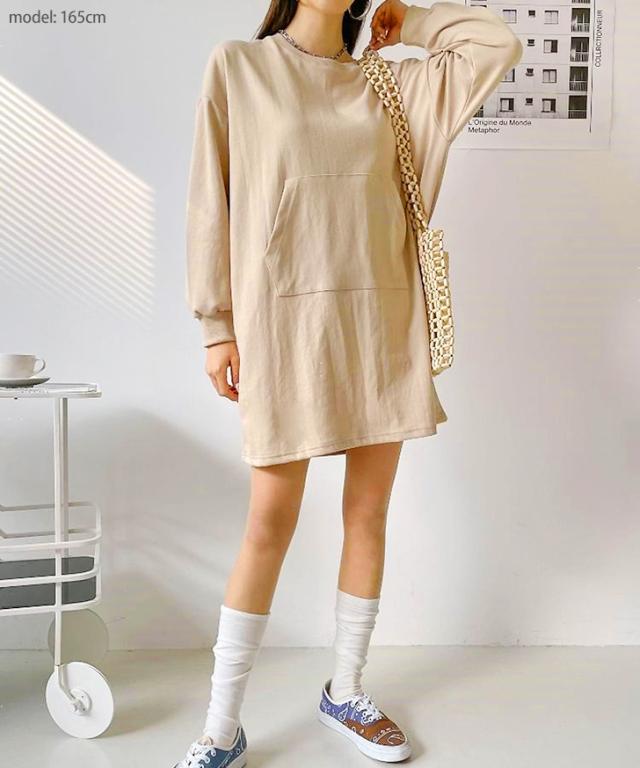 新作 スウェットカンガルーポケットチュニックワンピース レディース トップス 長袖 ゆったり 柔らか コットン混 綿混 ロングワンピース 膝丈 膝下 膝上 体型カバー スエット レイヤード 重ね着 大人 リラックス