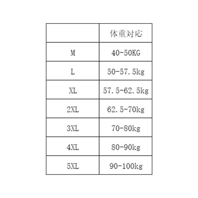 | サイズについての説明 | M: お勧め体重40-50kg L: お勧め体重50-57.5kg XL: お勧め体重57.5-62.5kg 2XL:お勧め体重62.5-70kg 3XL:お勧め体重70-80kg 4XL:お勧め体重80-90kg 5XL:お勧め体重90-100kg |