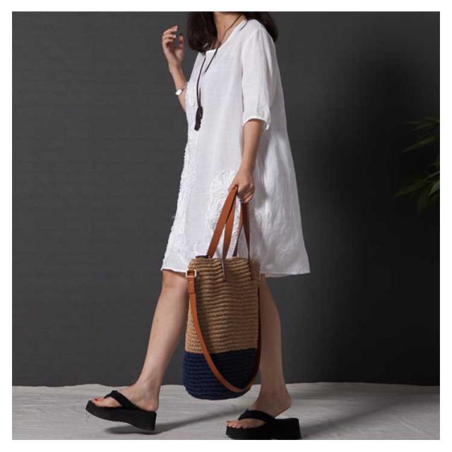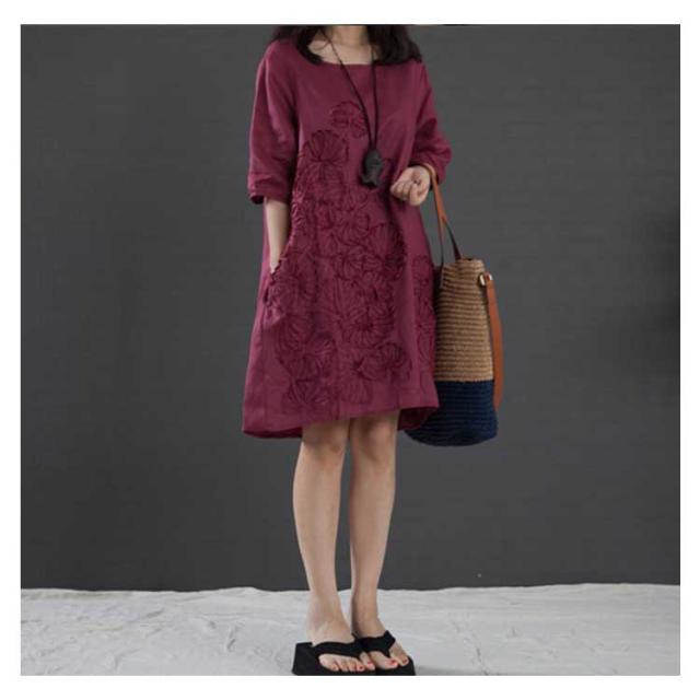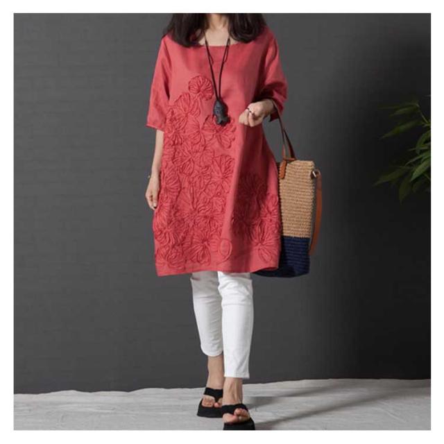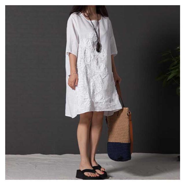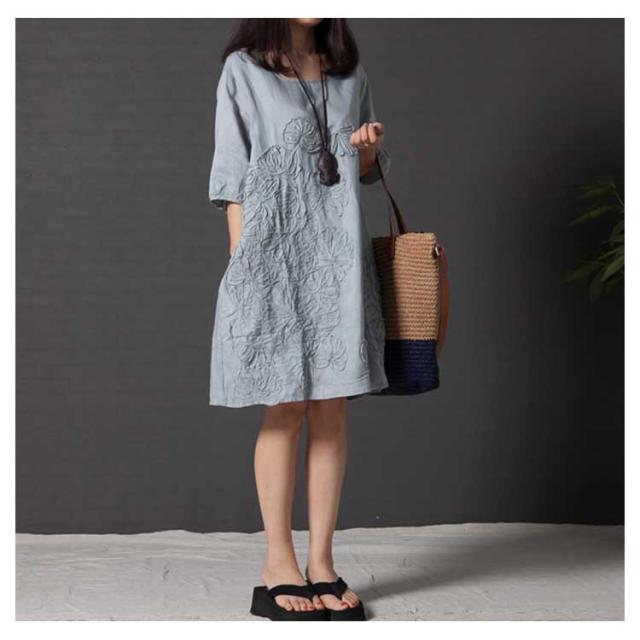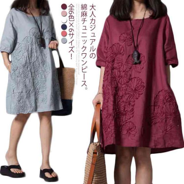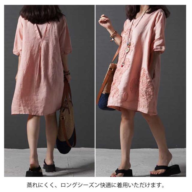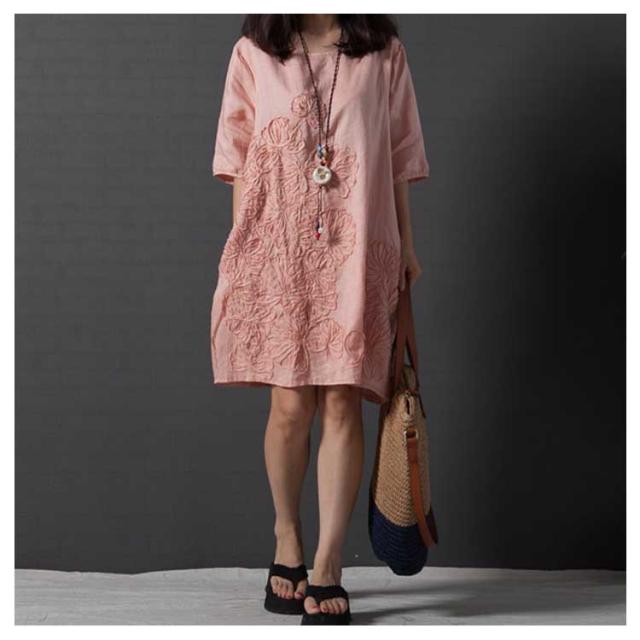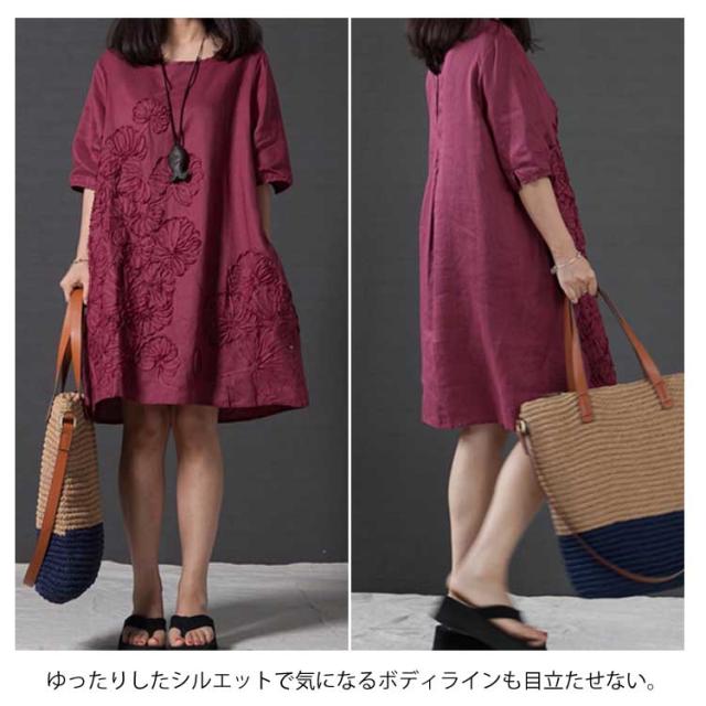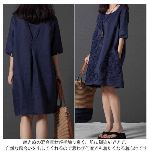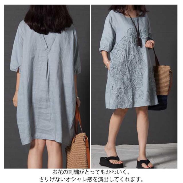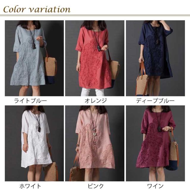 全6色×6サイズ!花柄刺繍ワンピース 綿麻 ワンピース 半袖 リネンワンピース カジュアルワンピース 刺繍 大きサイズ 春 夏 トレロ 可愛い ゆったり ミディアム送料無料