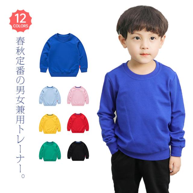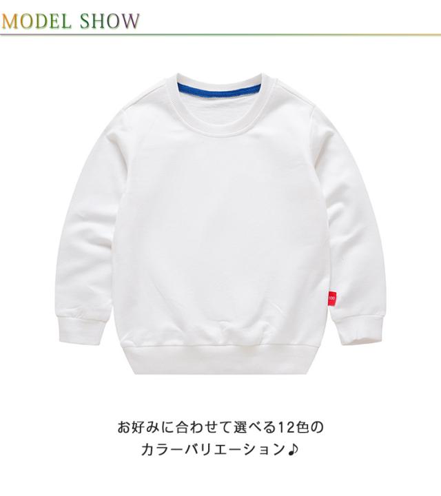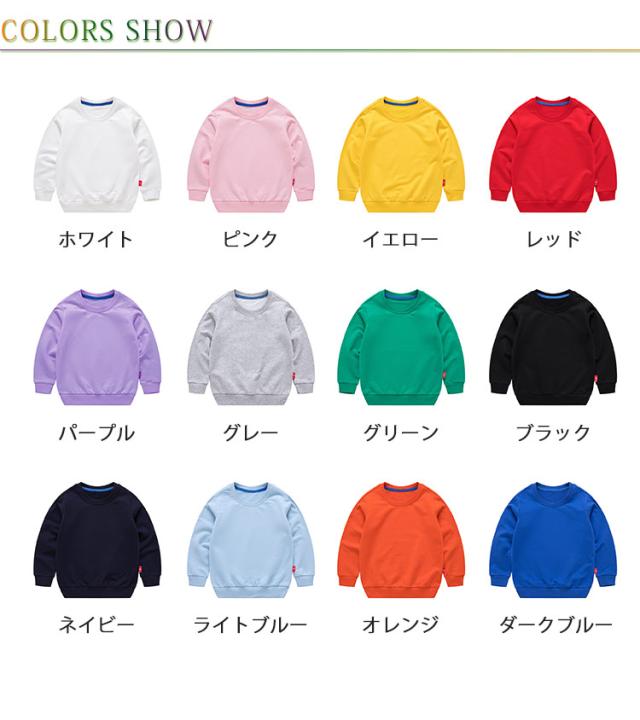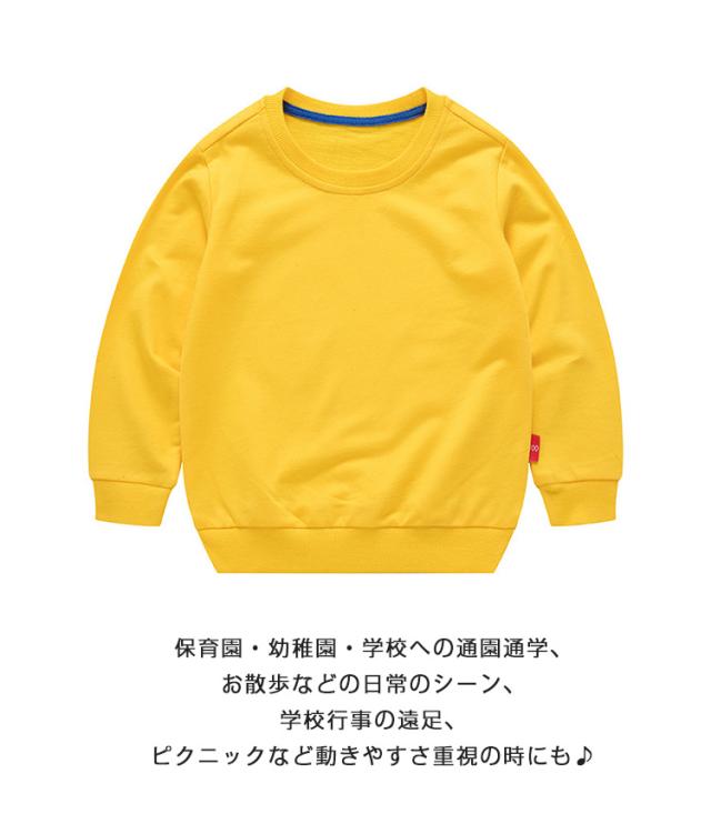 | 春秋定番の男女兼用トレーナー。 お好みに合わせて選べる12色のカラーバリエーション♪ 綿100素材でしっとりと柔らかい肌触りで着心地の良いトレーナー。 裾や袖、首回りにリブを入れたおしゃれなデザインです。 女の子、男の子問わずオシャレを楽しめる人気の子供服★ 保育園・幼稚園・学校への通園通学、お散歩などの日常のシーン、学校行事の遠足、ピクニックなど動きやすさ重視の時にも♪ | |
