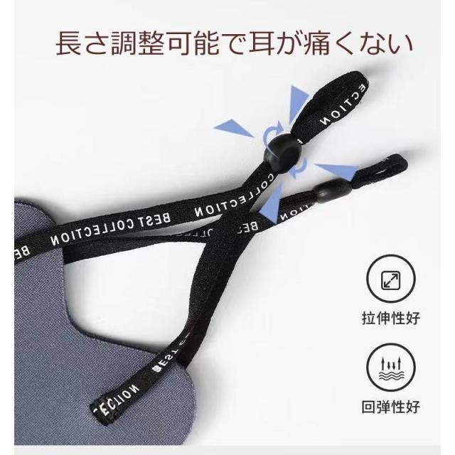 - ヒモの部分が長さ調整出来るので、あまり動かない時は緩めにすると耳が痛くならず、動きの多い時はキツめにすればマスクがズレずにすみます。