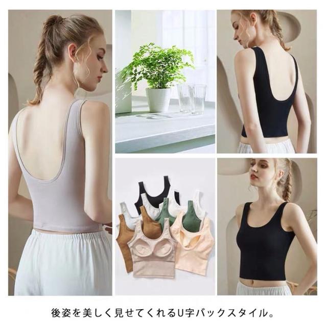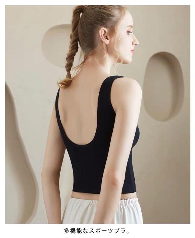 | 多機能なスポーツブラ。 首まわりやデコルテラインをすっきりと美しく見せてくれる。 後姿を美しく見せてくれるU字バックスタイル。 優しい肌触りのコットン素材が汗を素早く吸収。 ナイトブラ・インナータンクトップとしても使えます。 | |