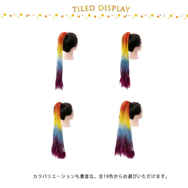 | 誰でも簡単に使えるゴム付きカラフル編み込みエクステ。 地毛と一緒に編み込んでもらってもいいし、ポニーテールやツインテールにそのまま付ける事も可愛い。 ダンス、イベント、フェス、ステージなど、衣装をより華やかに演出する時に最適!テンションが一気に上がる。 普段使いやハロウィンコスプレ、パーティー、仮装、文化祭など様々なシーンで活躍。 カラバリエーションも豊富な、全19色からお選びいただけます。 | |