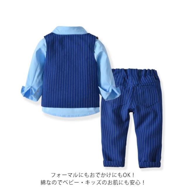 | お子様の晴れ舞台に大活躍間違いなしの男の子スーツ! ベスト+ワイシャツ+パンツ+蝶ネクタイのお買い得4点セット。 フォーマルにもおでかけにもOK!綿なのでベビー・キッズのお肌にも安心! 色んなフォーマルシーンで活躍する、セットアップスーツ。 卒業式、入学式、誕生日、パーティー、七五三、発表会等お子様の晴れの舞台に是非、お使い下さいませ。 | |