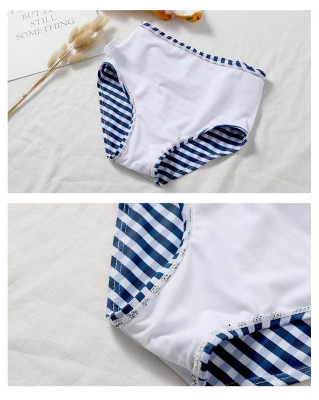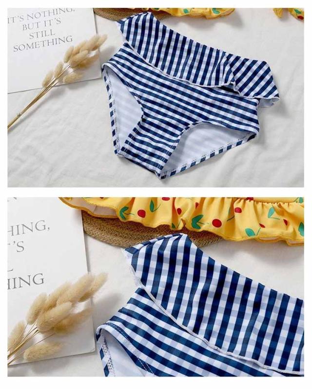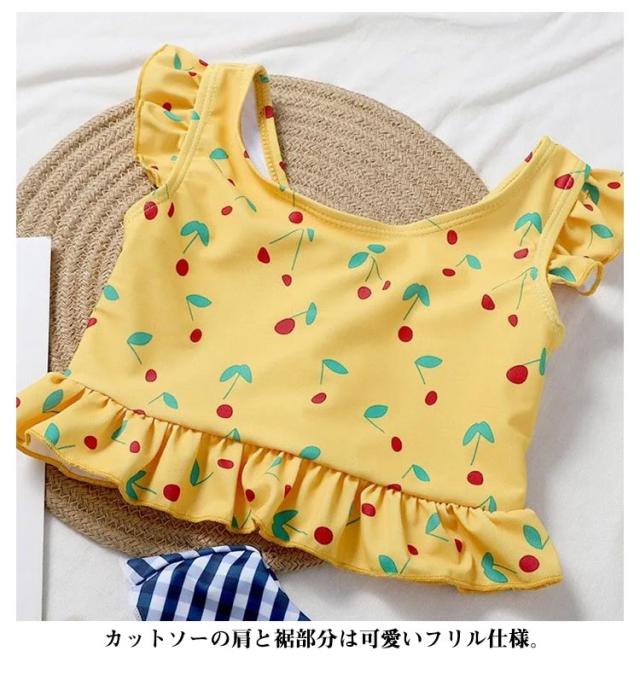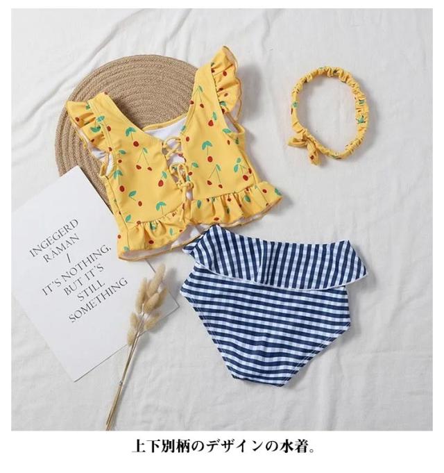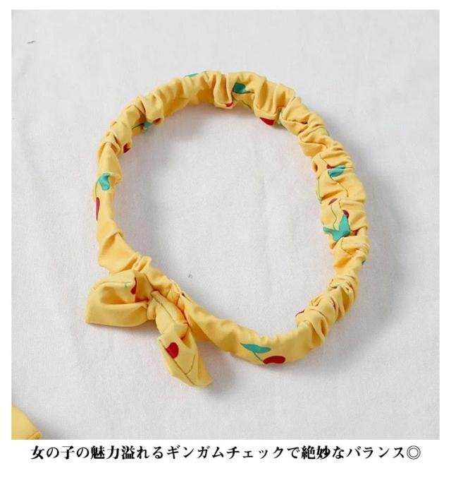 | 可愛いヘアバンド付き水着セット。 上下別柄のデザインの水着。 カットソーの肩と裾部分は可愛いフリル仕様。 女の子の魅力溢れるギンガムチェックで絶妙なバランス◎ セパレート水着はお着替えもトイレも楽チンでおすすめ!! | |