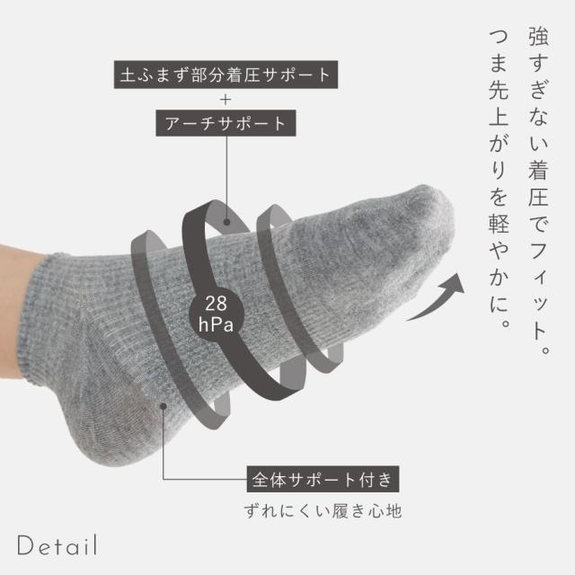 土ふまずサポートでフィット!モノトーンのソックスセット。土ふまず部分着圧サポート+アーチサポート、強すぎない着圧で気持ち良いフィット感。つま先上がりを軽やかにします。