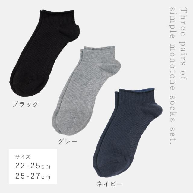 洗い替えにも便利!使いやすいモノトーンカラー、ブラック、グレー、ネイビーのセット。スニーカー丈です。