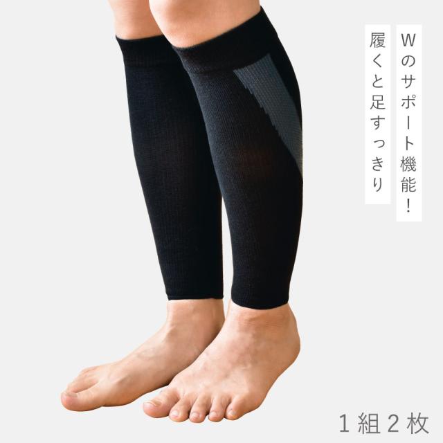 Wの機能!履くと足すっきりの着圧サポーター。段階着圧サポーターでふくらはぎリフレッシュ。ふくらはぎから足首にかけてサポートします。