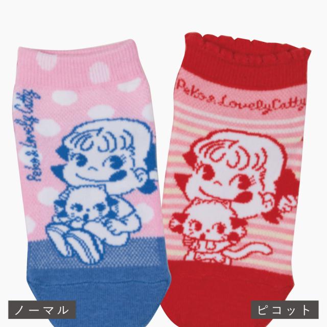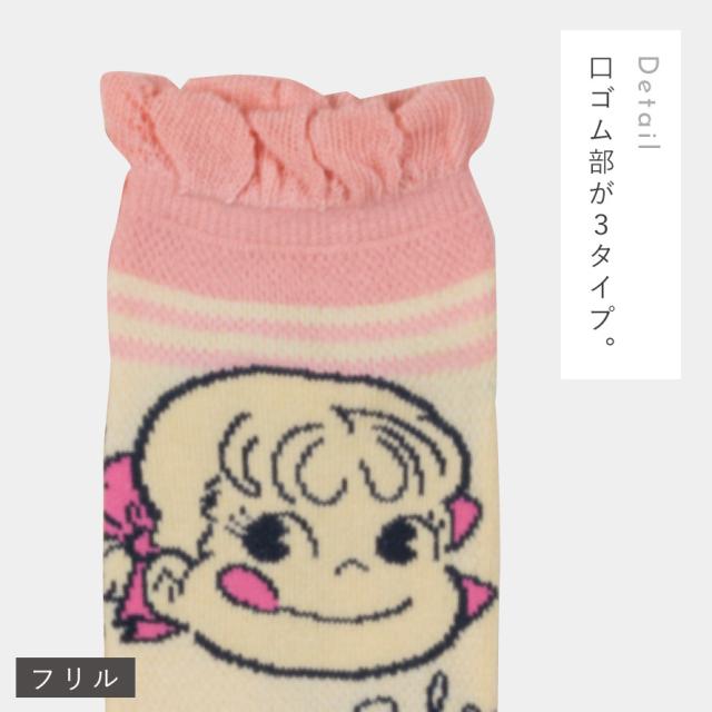 大人気!不二家キャラクター、ペコちゃんがプリントされた3柄組のソックスセット。口ゴム部がピコット、フリル、ノーマルタイプのデザイン。気分に合わせて選んで履ける!