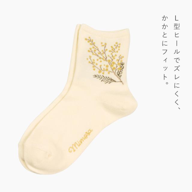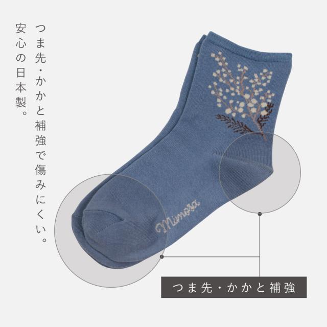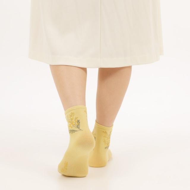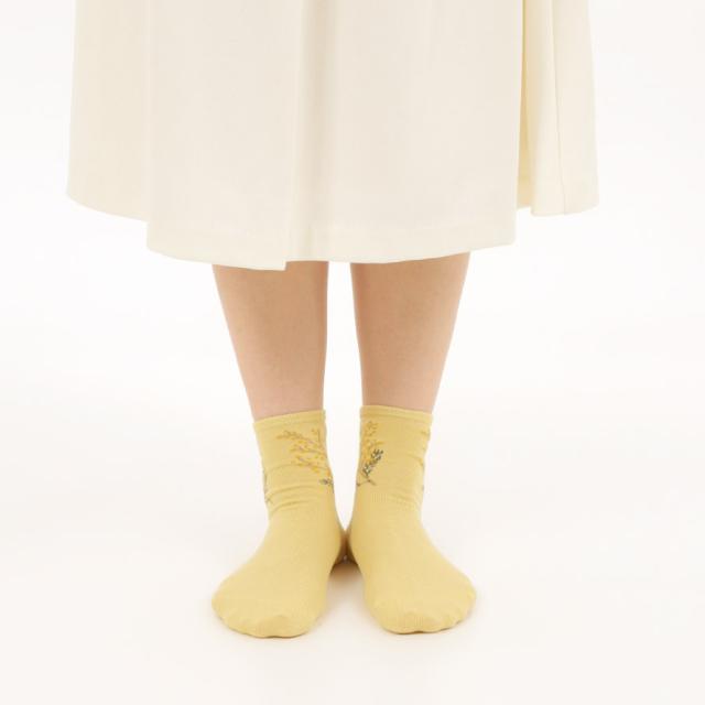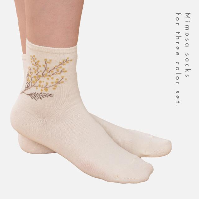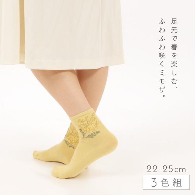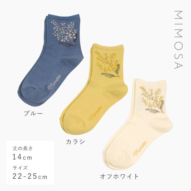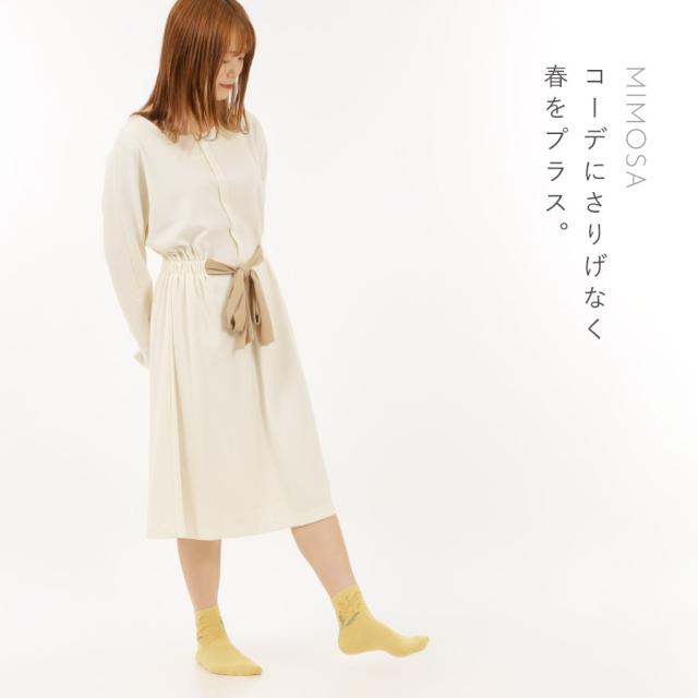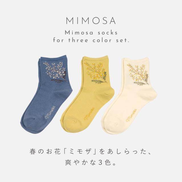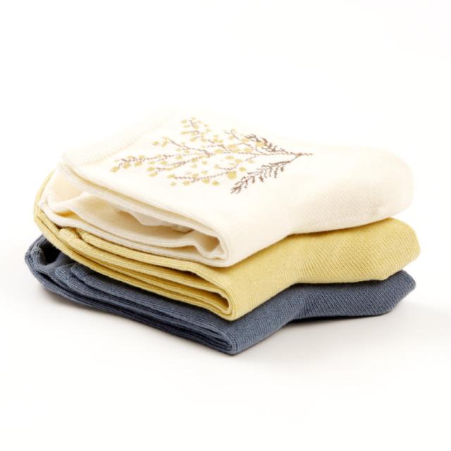 足元で春を楽しむ、ふわふわ黄色い「ミモザ」の花をあしらったソックスセット。爽やかな、ブルー・オフホワイト・カラシの3色のベースカラー。足首部分には可愛らしく咲くミモザ。日常にさりげなく春アイテムをプラスできます。
