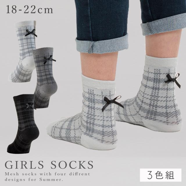 靴下 子供 キッズ 3色組 18-22cm 女の子 フォーマル リボン付きキッズチェック柄ソックス