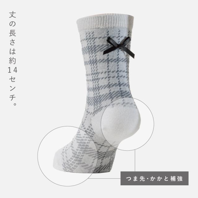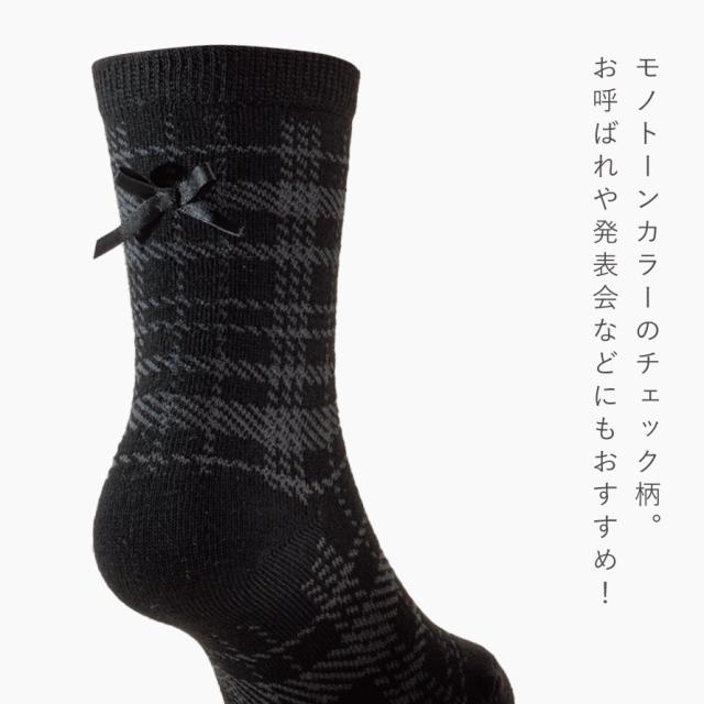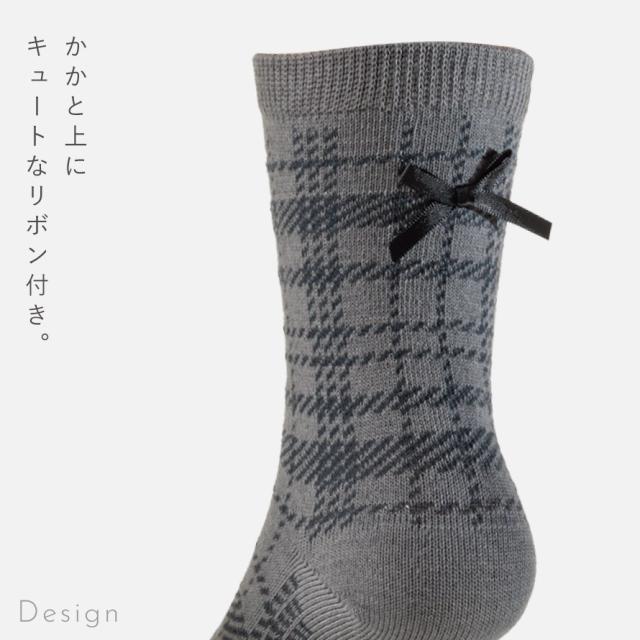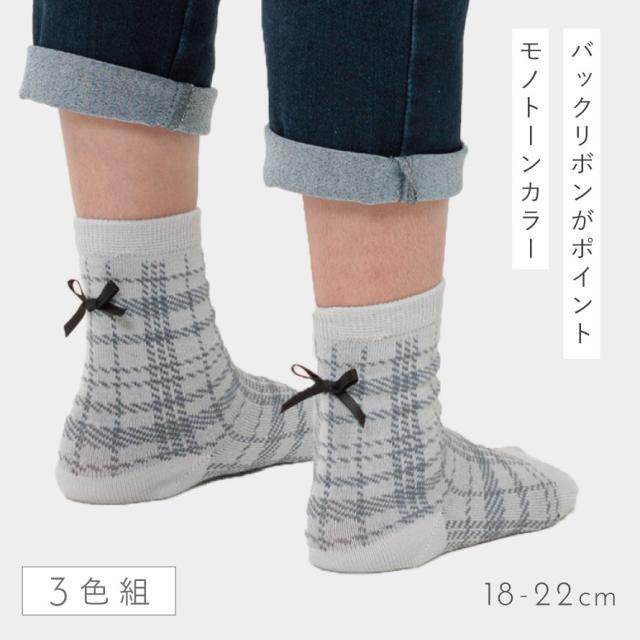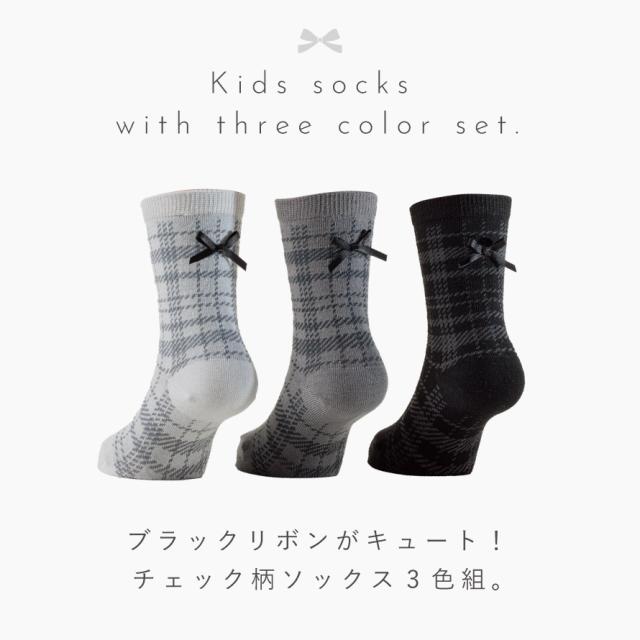 ブラックリボンがキュート!上品なチェック柄ソックス3色組。落ち着いたモノトーンカラーのチェック柄。かかと上についたブラックのリボンがポイント。お呼ばれや発表会など、お出かけ用にも重宝するソックスです。