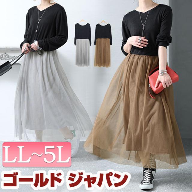 春新作 大きいサイズ レディース ワンピース チュールドッキングワンピース ワンピ ロングワンピース 長袖ワンピース 長袖 ロング マキシ チュール フレア ドッキング ウエストゴム Vネック ストレッチ 切替え 伸縮 春服 秋服 LL 2L 3L 4L 5L モカ グレー ゴールドジャパン