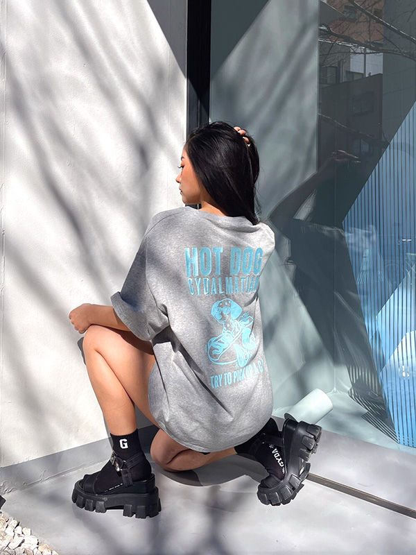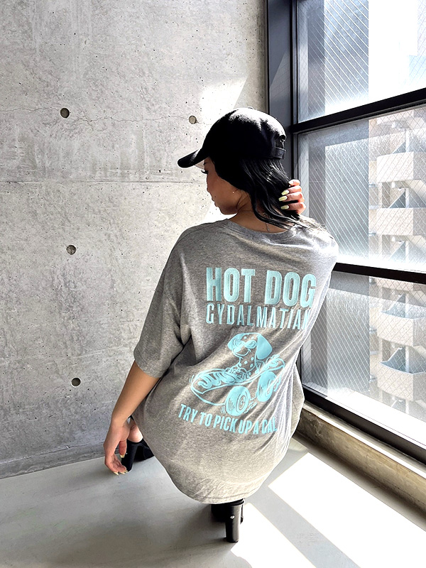 GYDA HOT DOG GYDALMATIAN BIG Tシャツ ジェイダ HOT DOG GYDALMATIAN BIG Tシャツ 【GYDA(ジェイダ)】 西海岸LAのちょっとエッジィなスタイリング、空気感をイメージ。 オンナらしい体のラインは露出しつつ、下品にならないアイテム。 ミニマルなアイテムをシルエットや色でスタイリングして、エッジィさを出すLAのギャルのように、 セクシーだけどカジュアルな女の子のためのスタイリングを提案します。 程よいオーバーサイズのシルエットに、 GYDA(ジェイダ)オリジナルキャラクターであるGYDALMATIANのNEWアートをバックに施した1着。 モノトーン(白黒)と、グレーのいつもと違うカラー配色の3色展開で、フロントにはGD刺繍を施したデザインです。 ロゴ意味【ギャルをナンパする】 ミニボトムでゆるっとワンピースっぽく着用の場合は、足元にボリュームを持たせるのがポイントです。 | ||||||||||||