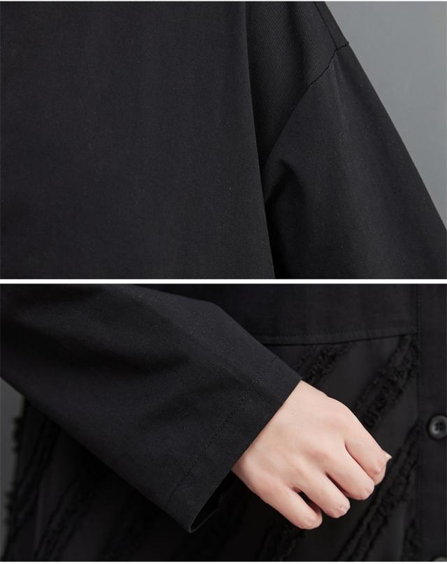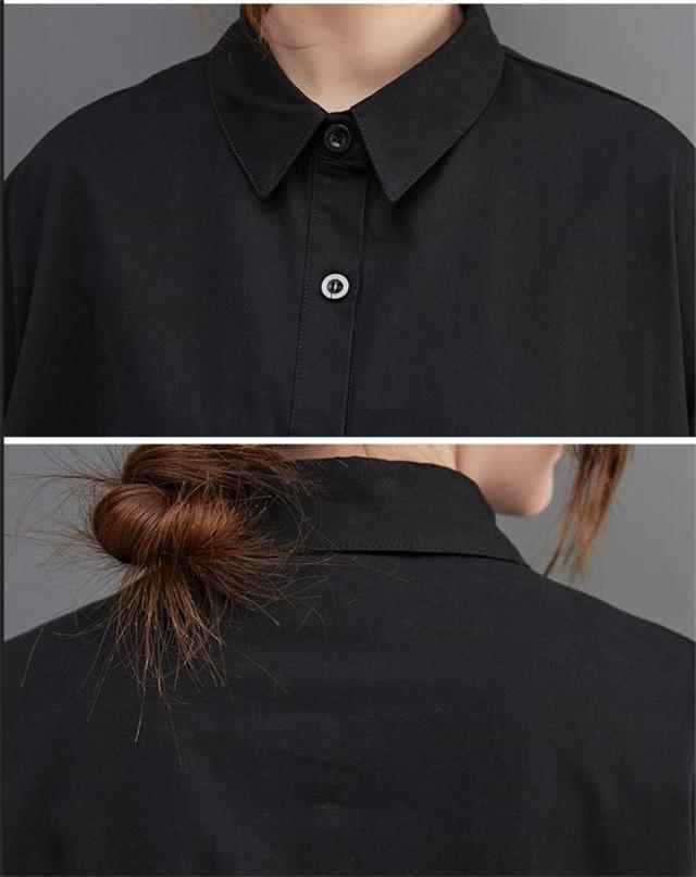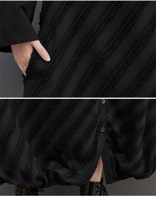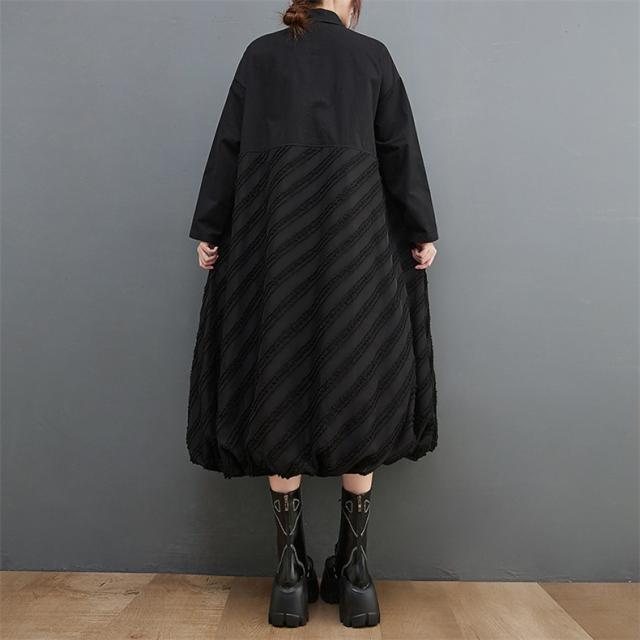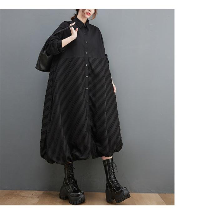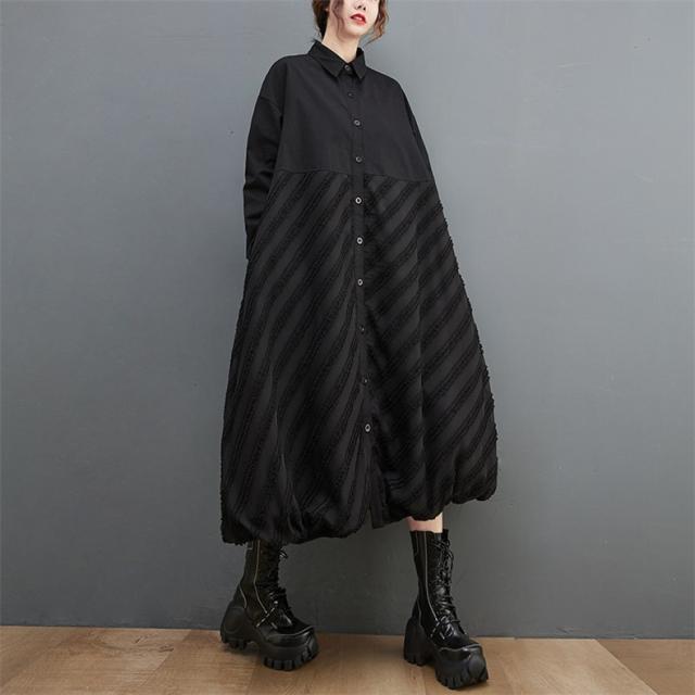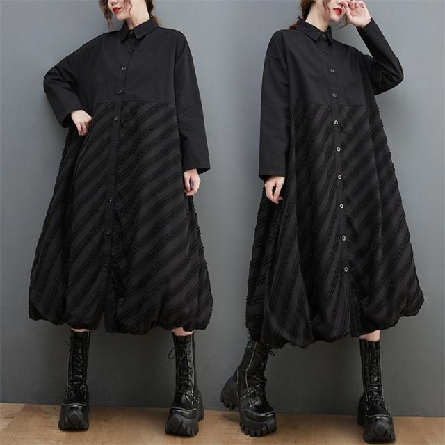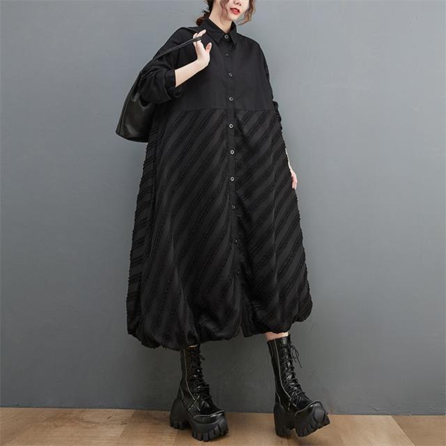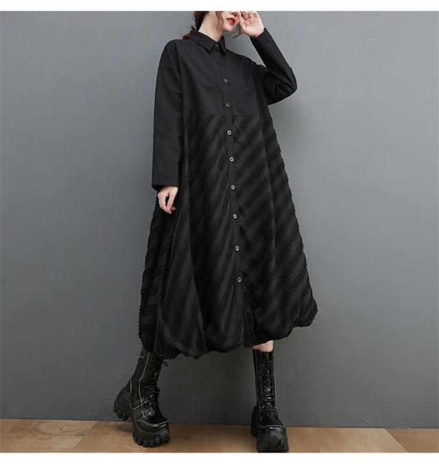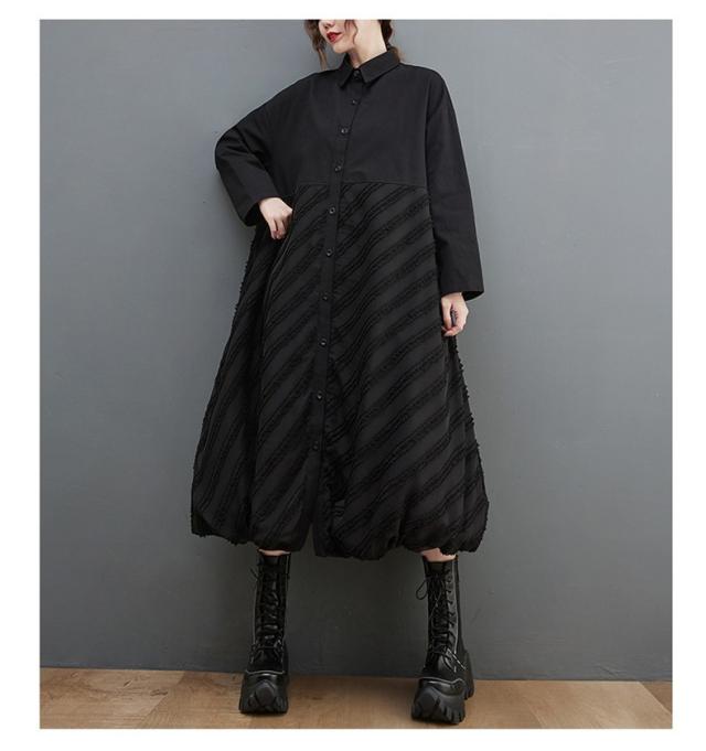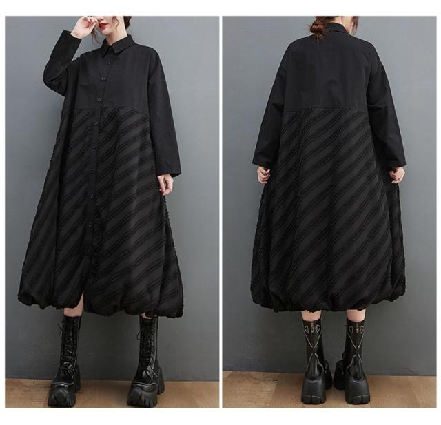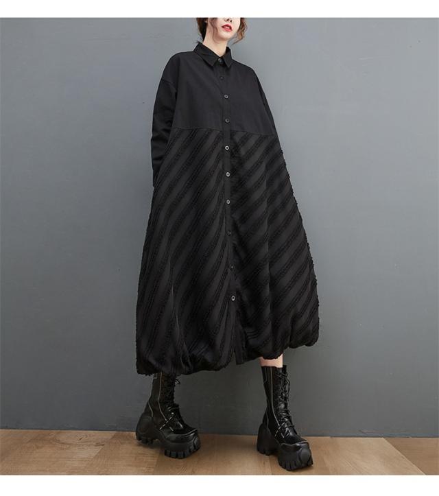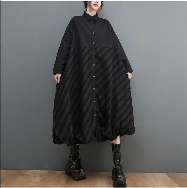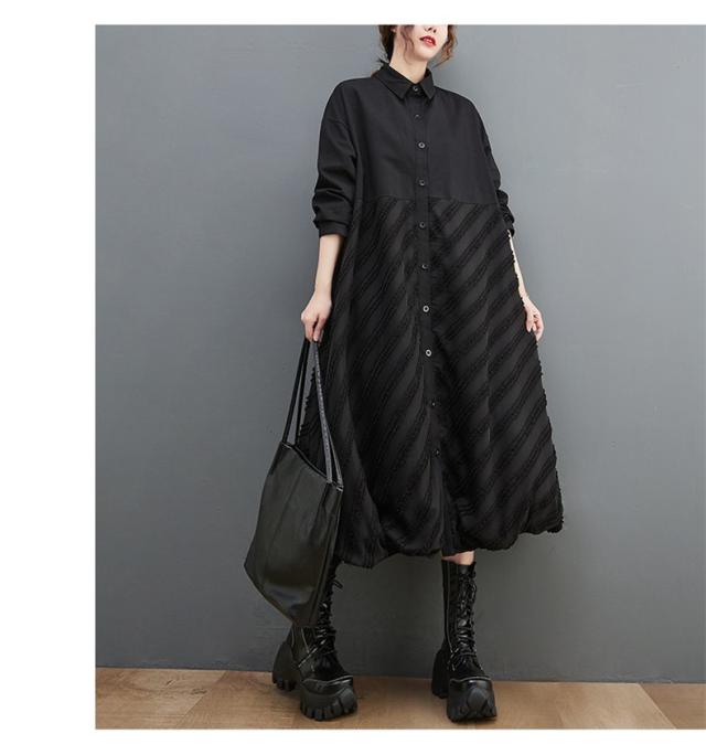 ワンピース ロング丈 レディース 黒 オーバーシルエット 切り替え 前開き 前ボタン留め 折り襟 ゆったり 大きいサイズ 間違いなしの優秀アイテム