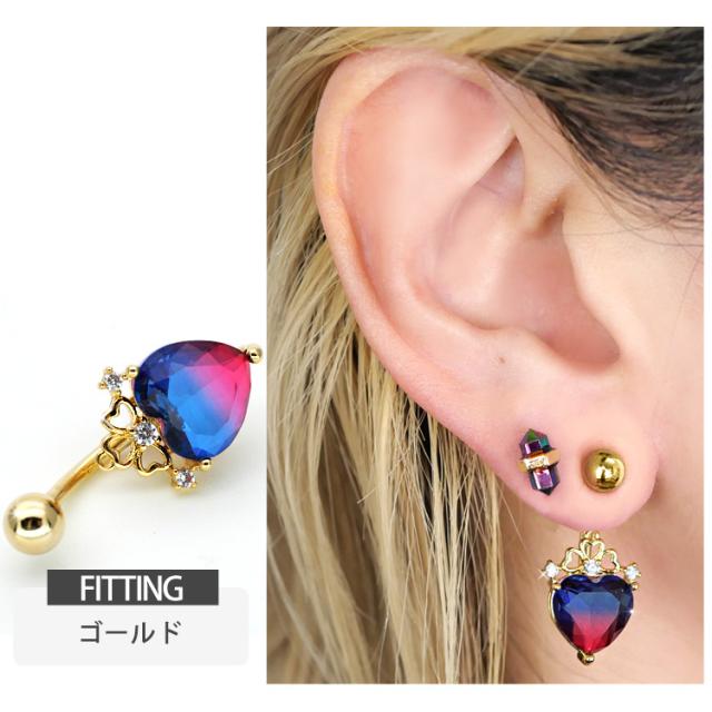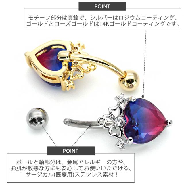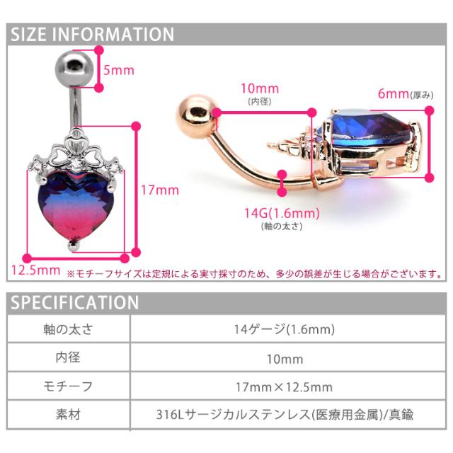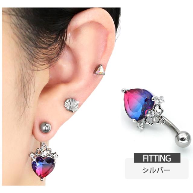 夕焼けのようなブルーからピンクへのグラデーションがかわいいハートジュエルピアスです。クローバーデザインの透かし模様とジュエルをあしらった飾りが大人可愛い。太さのサイズは一般的なへそピアスに使用させる14Gサイズです。ホールに直接触れる軸とボール部分はお肌が敏感な方にも安心してお使いいただける、サージカル(医療用)ステンレス素材。シルバーモチーフは真鍮にロジウムコーティング、ゴールドとローズゴールドモチーフは真鍮に14Kゴールドコーティングを施しております。
