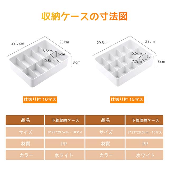 10マス:29.5*23*8cm/15マス:29.5*23*8.cm/収納ボックスのふた:29.8*23.3cm。複数の収納ボックスを重ね合わせることができますので、十分に空間が利用します。 耐久性があり、用途が広く、実用的な収納ボックスです。