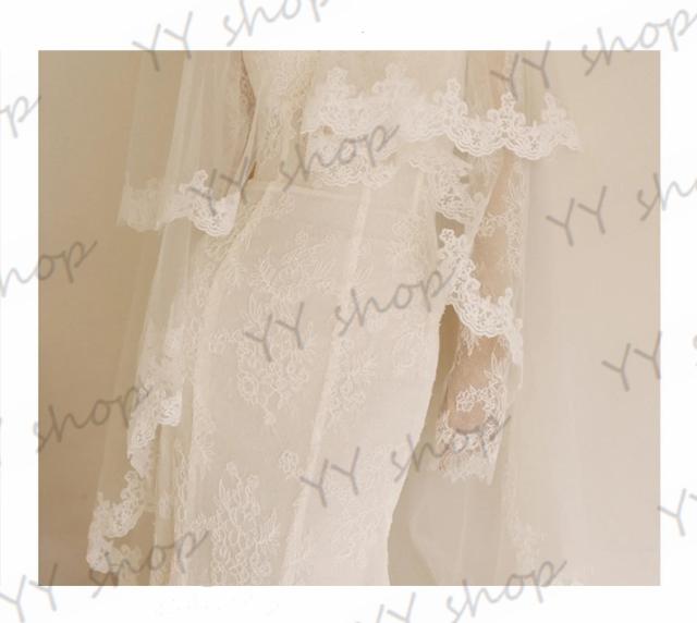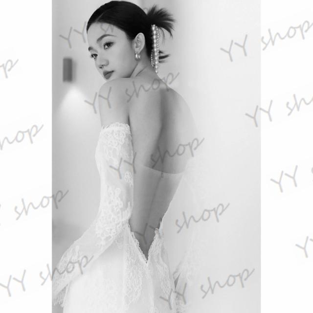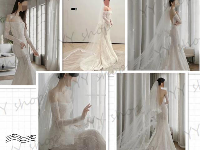 レース マーメイドライン ウェディングドレス トレーン オフショルダー 長袖 スレンダーライン バックレス 白 結婚式 撮影 イベント H066