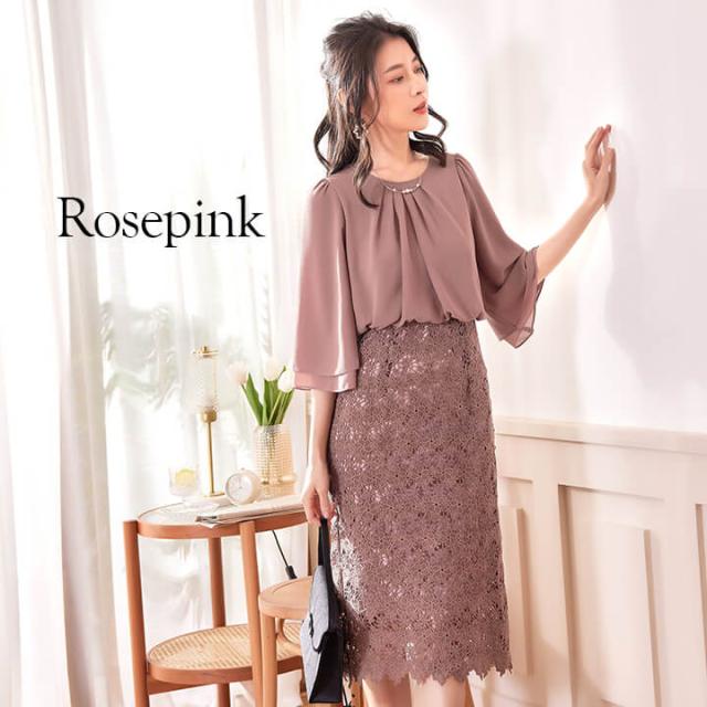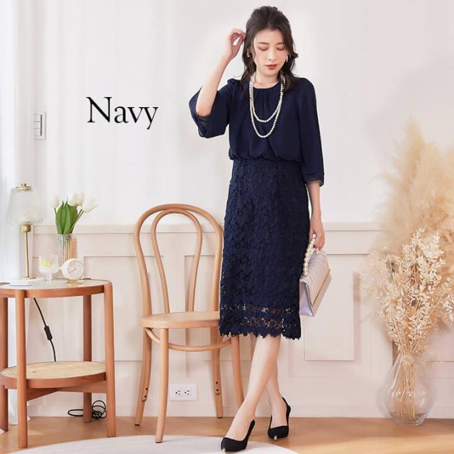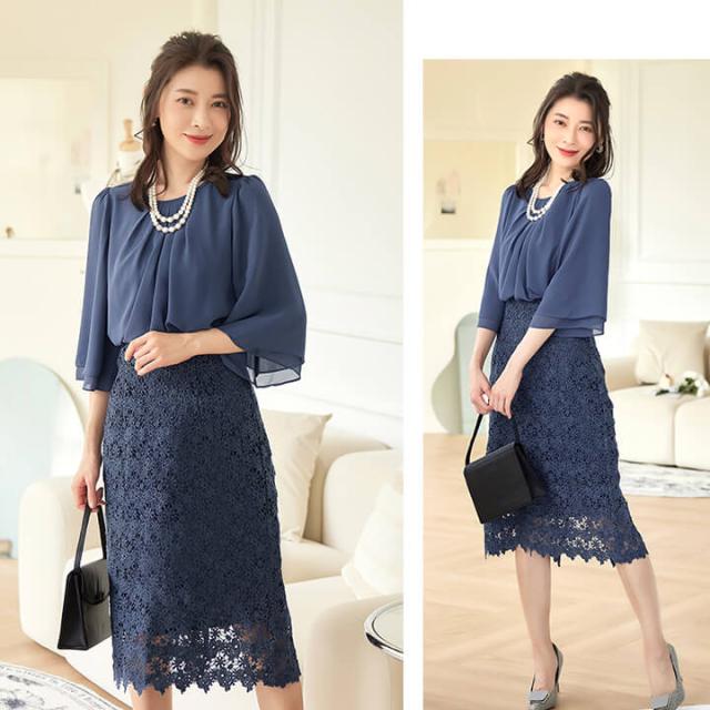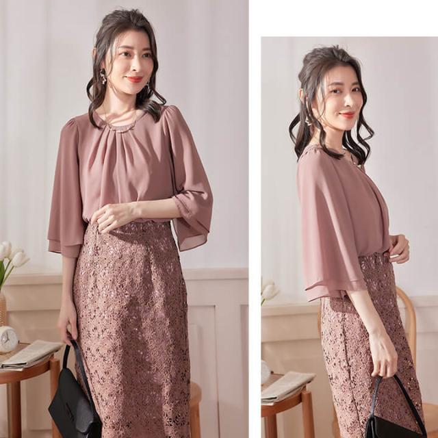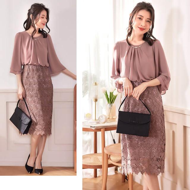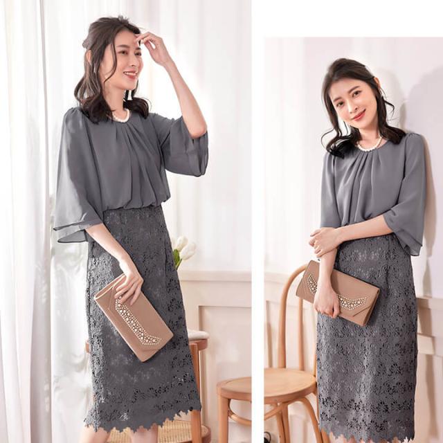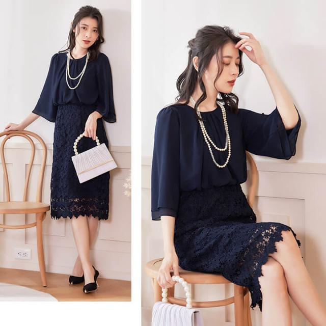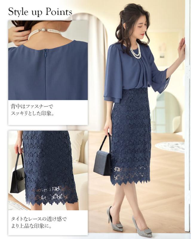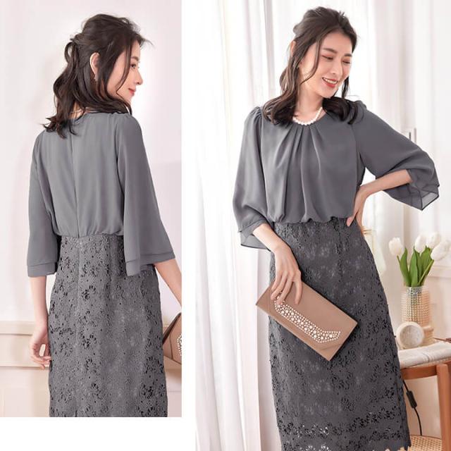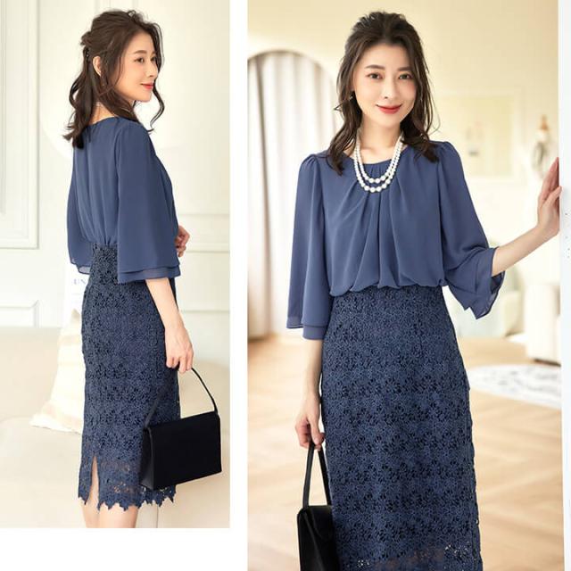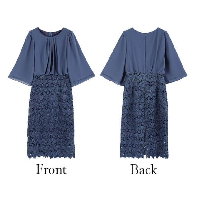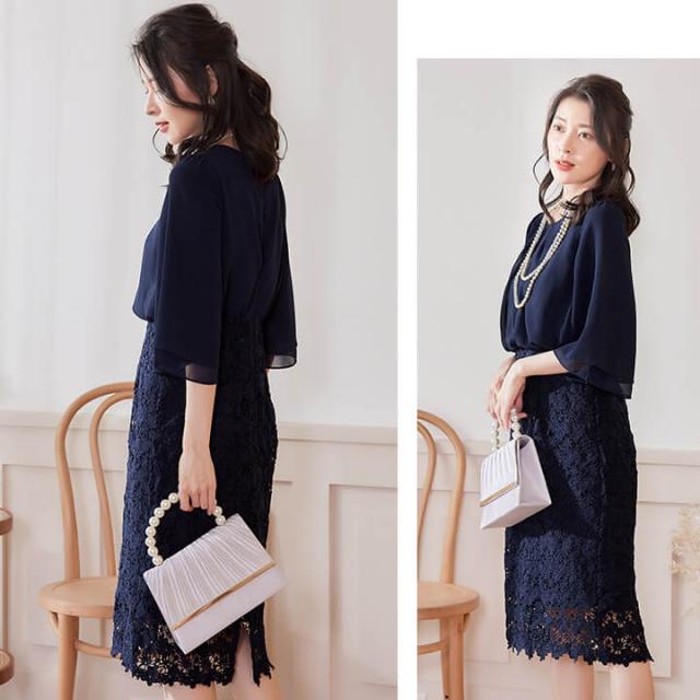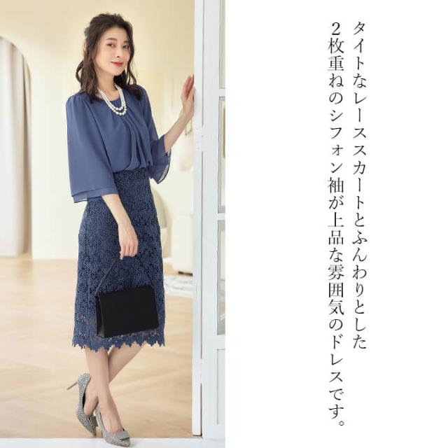 タイトなレーススカートとふんわりとした2枚重ねのシフォン袖が上品な雰囲気のドレス。