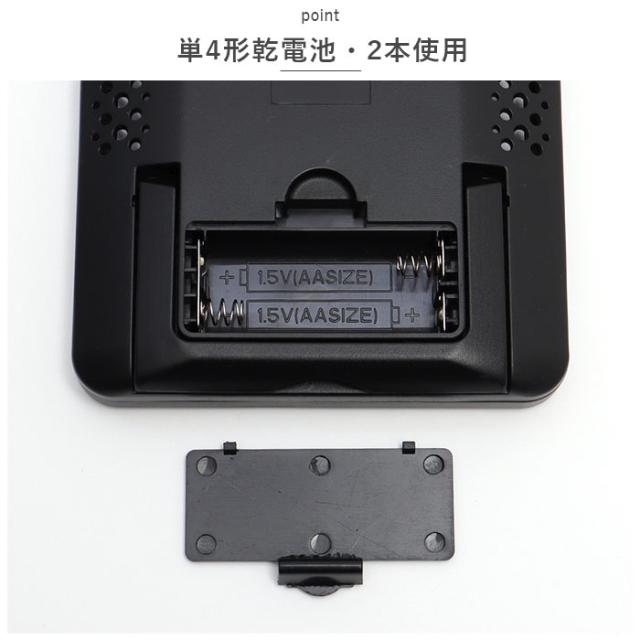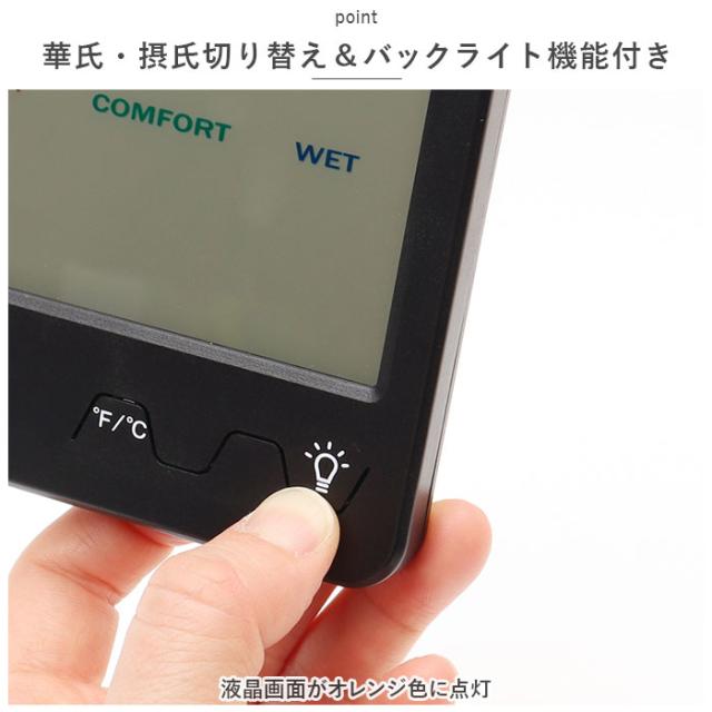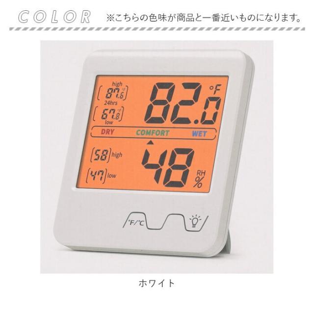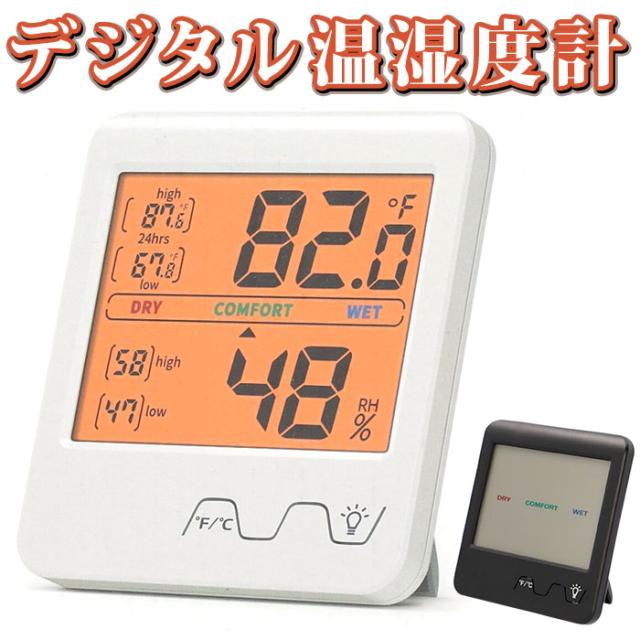 | 商品説明 | ・温度・湿度がひと目で確認できて、ご家族の健康管理に役立つ!シンプルで見やすい「デジタル温湿度計」が新登場。 【大きめで見やすい液晶表示】 ・離れたところからでも見やすい大きめの文字で、上段に室内の「温度」、下段に「湿度」を表示したシンプルデザイン。 【快適度をひと目で確認!】 ・「DRY:乾燥状態」・「COMFORT:快適状態」・「WET:多湿状態」の3つの表示で、お部屋の快適度を視覚的にチェックが可能。 【24時間変化もチェック】 ・過去24時間の最高温度・湿度、最低温度・湿度を合わせて表示することで、急な温度・湿度の変化も見逃さない!エアコンの温度コントロールの参考になって便利。 【バックライト機能付き】 ・電球ボタンを押すだけで、液晶画面がオレンジ色に点灯。お休み前の照明を落としたお部屋でも温湿度チェックが楽ちん。 【華氏・摂氏切り替え機能】 ・温湿度計前面の切り替えボタンで、お住いの地域に合わせて、華氏表示(°F)と摂氏表示(°C)を切り替え可能。 【置き・掛けどちらもOK!】 ・スタンドを広げてテーブルやキャビネットに置いたり、背面のフック穴で壁掛けにもできる2WAY仕様。 【快適な室内環境づくりに】 ・寒さや乾燥が気になる時期の風邪予防や、真夏の熱中症対策など、ご家族の健康管理にオススメの便利アイテム。単4形乾電池・2本使用。(※電池は別売りです。) |