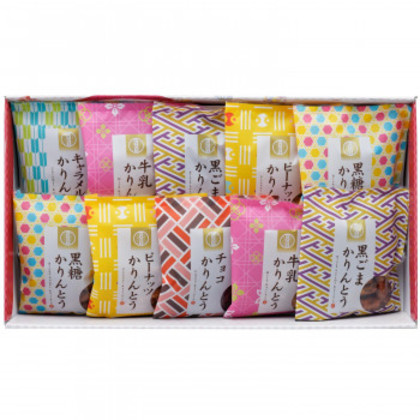 商品詳細:6種類のフレーバーを楽しめるかりんとう詰め合わせです。 生産国:日本 内容量:黒ごまかりんとう45g×2、黒糖かりんとう45g×2、牛乳かりんとう45g×2、ピーナッツかりんとう45g×2、チョコかりんとう45g×1、キャラメルかりんとう45g×1 仕様:化粧箱入 賞味期間:120日