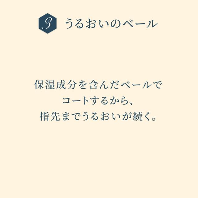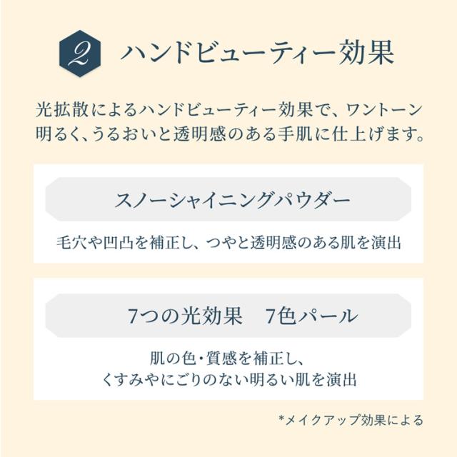 ●光拡散によるメイクアップ効果(ハンドビューティー効果)で、つけた時からくすみをカバーし明るい手肌に仕上げ、保湿成分を含んだベールでコートするから、指先までうるおいが続く。