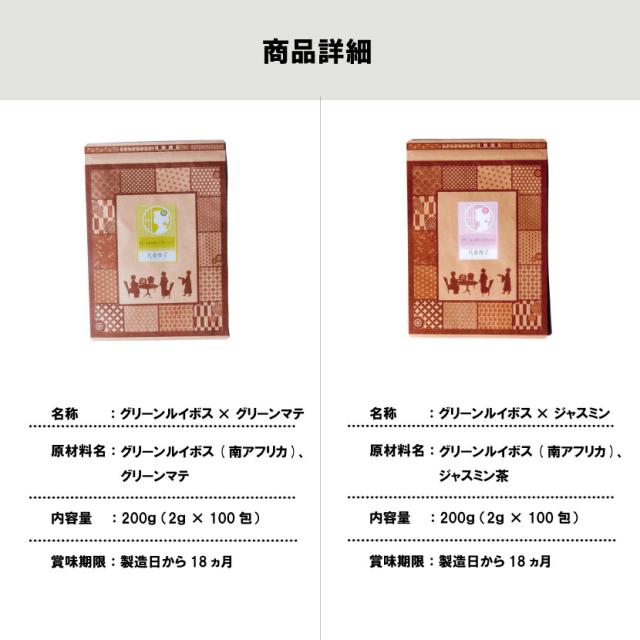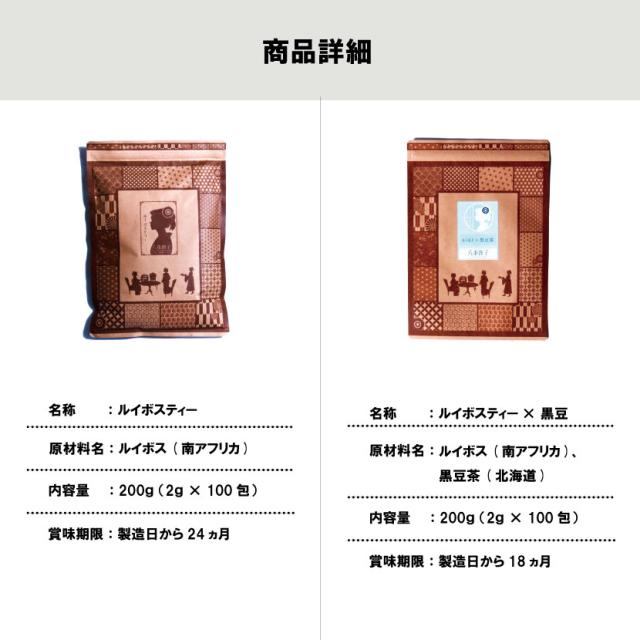 ■賞味期限/保存方法:製造日から18ヵ月(ルイボスティー×黒豆茶、ルイボスティー×ハトムギ、ルイボスティー×国産茶葉ブレンド、グリーンルイボス×グリーンマテ、グリーンルイボス×ジャスミン)、製造日から24ヶ月(ルイボスティー)/高温多湿を避け直射日光があたらない場所で保管してください。