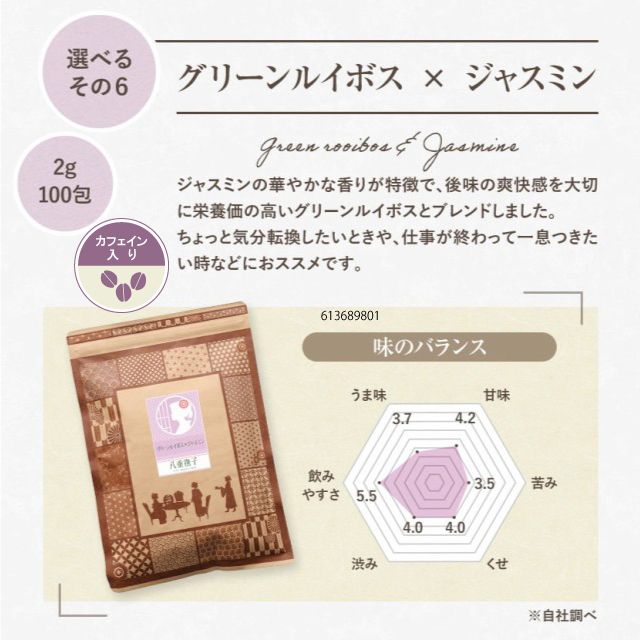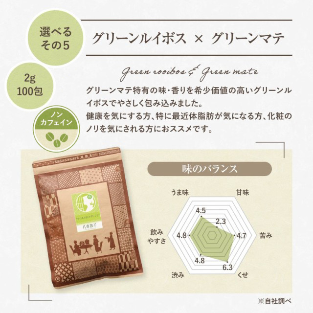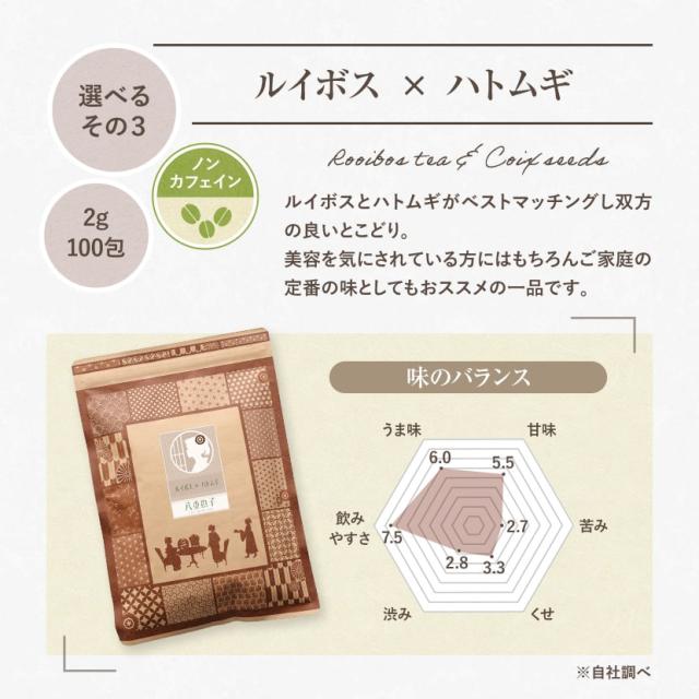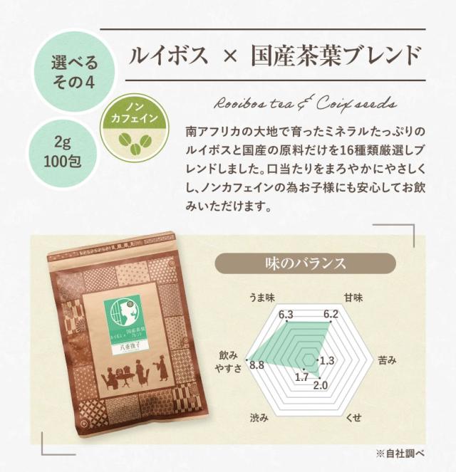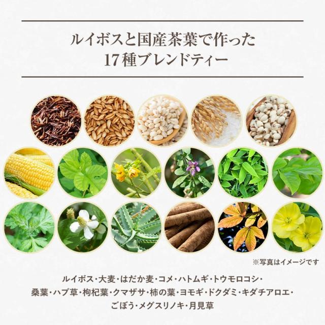 ■原材料:ルイボス(南アフリカ)、グリーンルイボス(南アフリカ)、黒豆茶(北海道)、はと麦茶(国産)、大麦、はだか麦、コメ、はと麦、トウモロコシ、桑葉、ハブ草、枸杞葉、クマザサ、柿の葉、ヨモギ、ドクダミ、キダチアロエ、ごぼう、メグスリノキ、月見草、グリーンマテ茶、ジャスミンティー