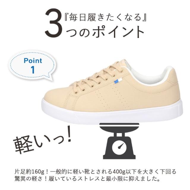 | 超軽量ソールで、軽い!疲れにくい!歩きやすい!の三拍子! コートスニーカーはフラットなソールとシンプルなデザインが持ち味。カジュアルからきれいめまでスタイルを選ばないので一足は持って痛いアイテムです。その中でも驚くのはその軽さ。毎日履いても疲れにくく、通学や通勤にもおススメです! ★毎日履きたくなる3つのポイント★ ・一般的に軽い靴とされる400g以下を大きく下回る160g! ・カップ形状のインソールで、靴内での足が動きづらく包むようにフィット! ・軽いだけではなくソフトで返りの良い靴底。快適な歩行をサポートします! |