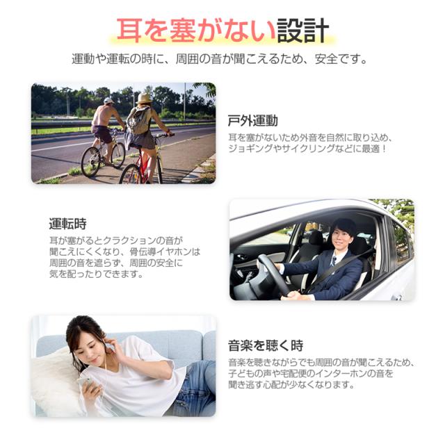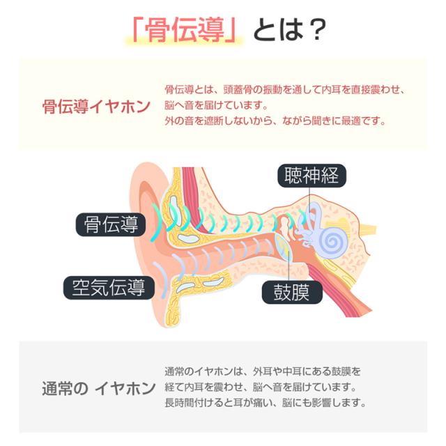 【耳を塞がない骨伝導式】“耳を塞がない”という新発想をプラスした骨伝導式イヤホンが登場ました。耳ではなく骨の振動を利用して音を伝える骨伝導イヤホン。耳をふさがない構造から、ながら作業やながら聴きに適しています。