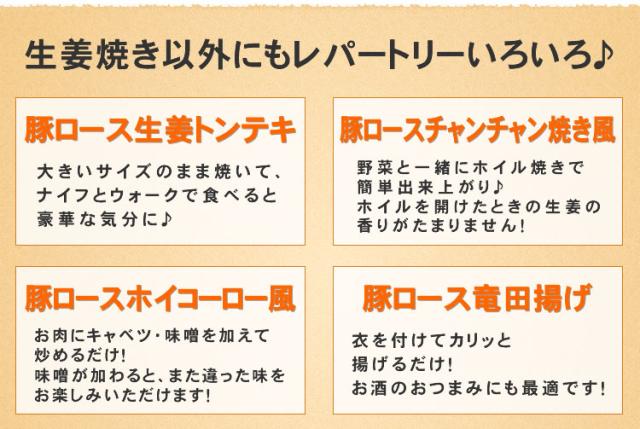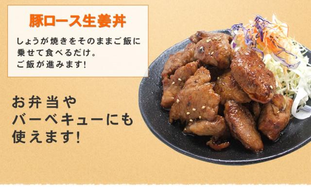 ・原材料名:豚ロース(米国産、カナダ産)、たれ(砂糖、しょうゆ、たん白加水分解物、食塩、おろしにんにく、おろししょうが、香辛料/甘味料(ソルビトール)、アルコール、調味料(アミノ酸等))、おろししょうが(しょうが/pH調整剤、増粘剤(キサンタン)、酸化防止剤(V.C))、(原材料の一部に豚肉・小麦・大豆・ゼラチンを含む)