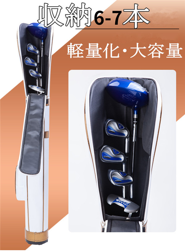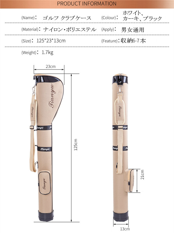【商品特徴】◎リーズナブルかつ機能的で高品質なクラブケース。◎手軽で持ち運び自由自在のクラブケース。◎頑丈な高品質生地を採用。接続部やベルトも高品質の金属素材を搭載。◎ケースの底部分には「クッション」装備、大事なクラブを外部の衝撃から保護。◎便利で収納性の高いポケットでゴルフグッズ、タオルなどたっぷり収納可能◎使いたいクラブだけを持って、自転車、徒歩でも気軽に打ちっ放しや練習に。◎車のトランクに収納しておいてもとても便利!【 商品スペック】■サイズ:125*23*13cm■収納可能クラブ数:6−7本 ■重さ:約1700g■原産国:中国