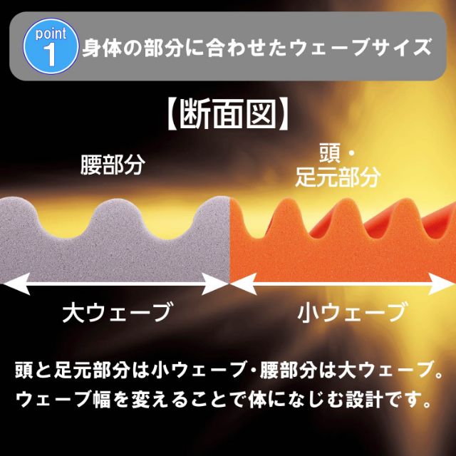 ◆頭、足元部分は小さめのウェーブ、腰部分は大きめのウェーブとウェーブの幅を変えることで体になじみやすい設計にしました。