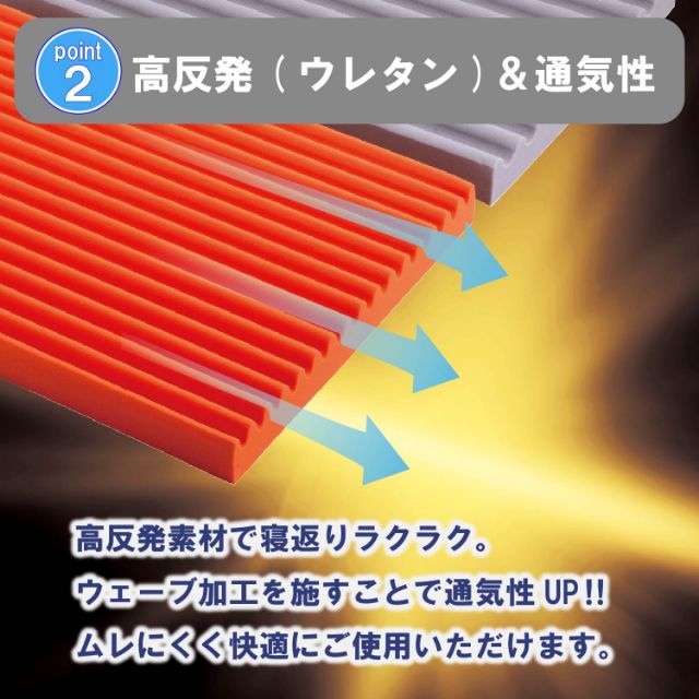 高反発ウレタンで体をしっかり支え、寝返りラクラク。快適な寝心地をお届けする「ANY MAT PLUS(エニーマットプラス)」。◆ウエーブ加工を施すことで通気性に配慮。さらに側生地の裏生地には通気性の良いメッシュ生地を使用しています。