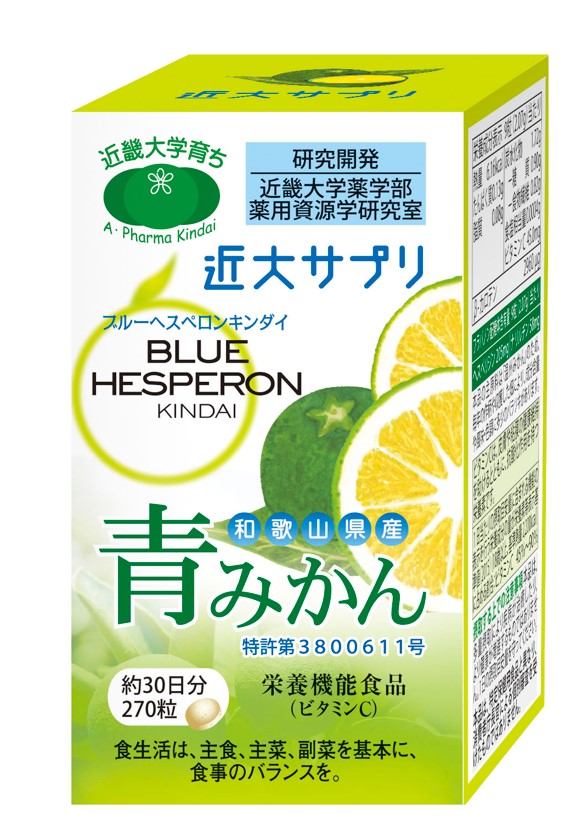 近畿大学薬学部薬用資源学研究室では、長年日本人になじみの深い温州みかんの有効性を研究し、青い時期の早積みみかんに新しいパワーを見出しました。本品はその青みかんの有用成分ヘスペリジン・ナリルチンの含有量が最も高い時期に収穫し、青みかんまるごとを独自の手法によって加工したものを使用しています。