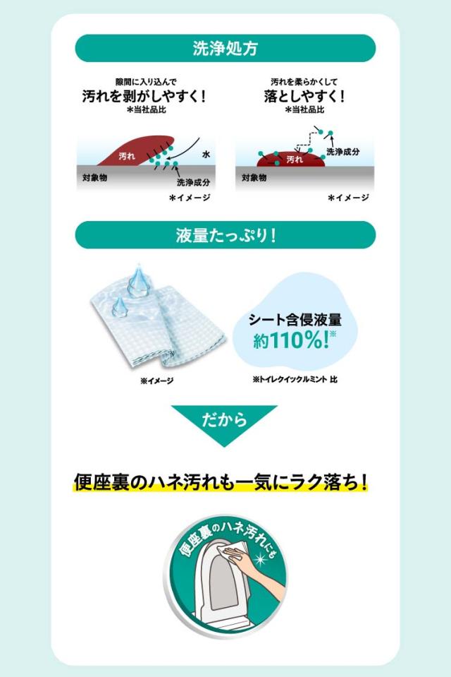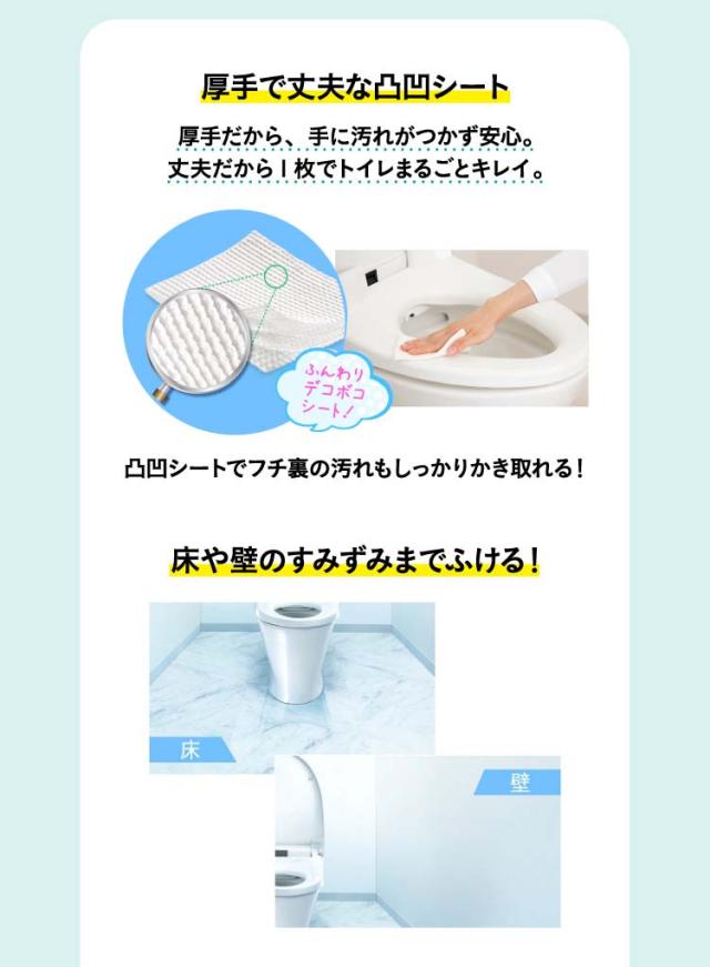 ●液量たっぷりだから、便座裏のハネ汚れも一気にラク落ち!厚手で丈夫な凸凹シートで、トイレまるごとこれ1枚ですっきり。