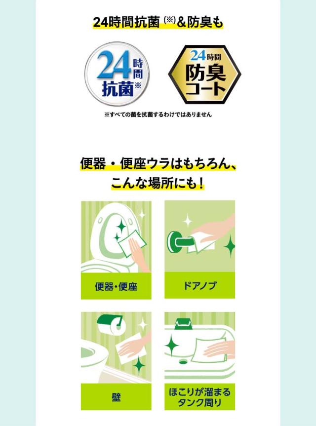 ●便器・便座裏はもちろん、ドアノブや壁、ほこりが溜まるタンク周りにも使えます。